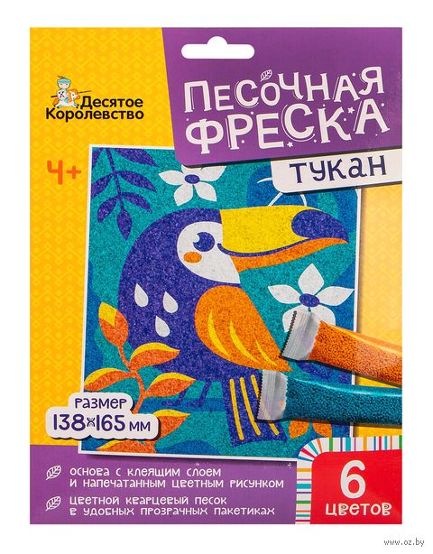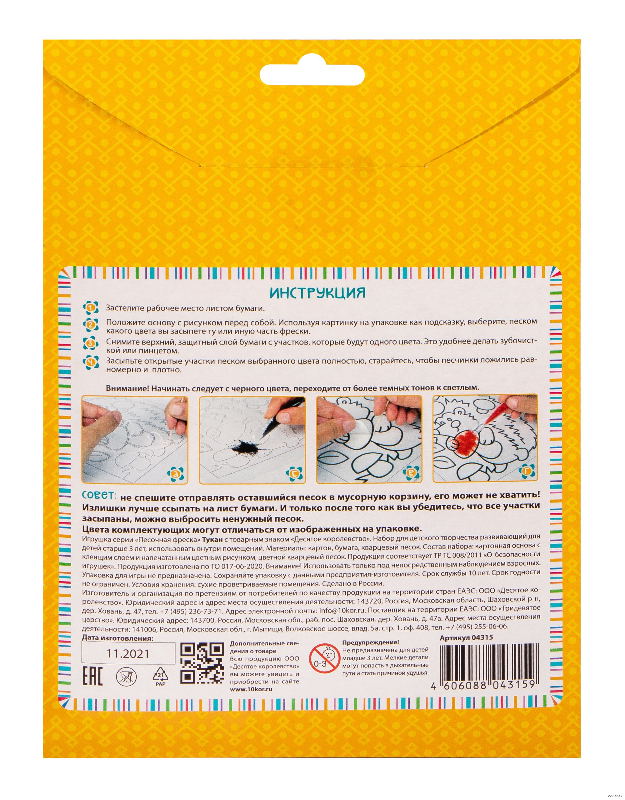 При помощи данного набора вы сможете создать замечательную картину из песка. При выборе цветовой гаммы для картинки можете ориентироваться на рисунок, изображенный на упаковке. Снимайте с каждого элемента верхний защитный слой и засыпайте его песком выбранного цвета.
