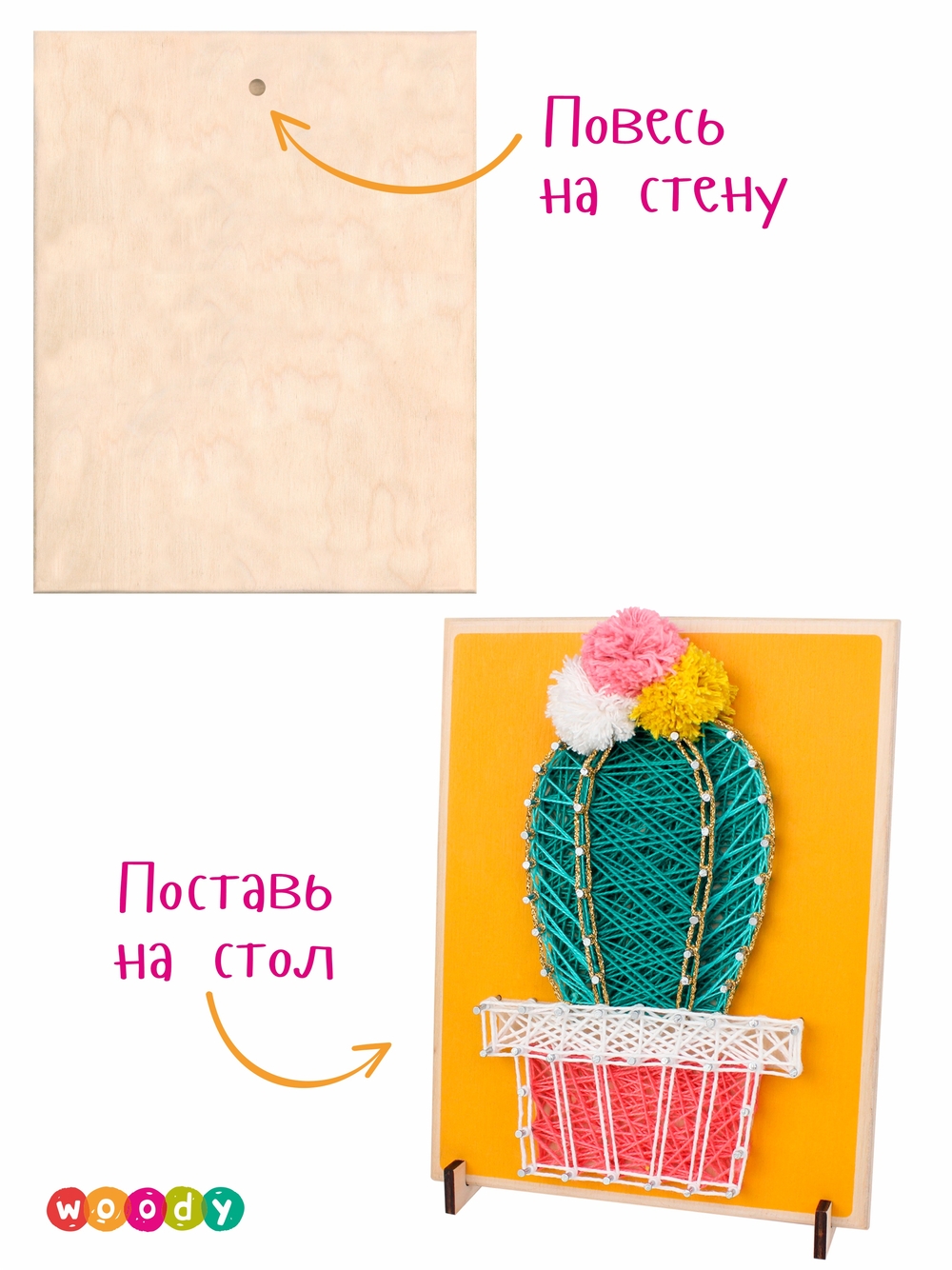 В хобби-набор входит специальный держатель для гвоздей, окрашенная безопасной краской деревянная основа, подставка и нитки на катушке. Вбейте гвозди по трафарету. Обвяжите контуры фигур и заполните цветом в несколько слоёв. Результат – яркое украшение подвесное настенное для интерьера детской комнаты, милое панно для декора рабочего стола или полки.