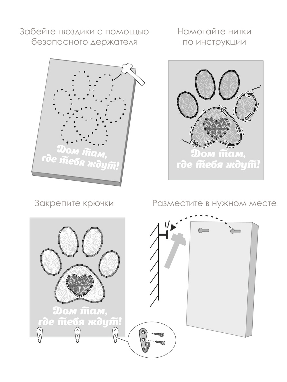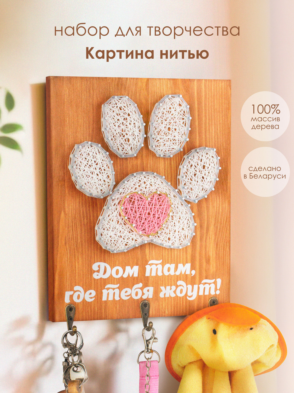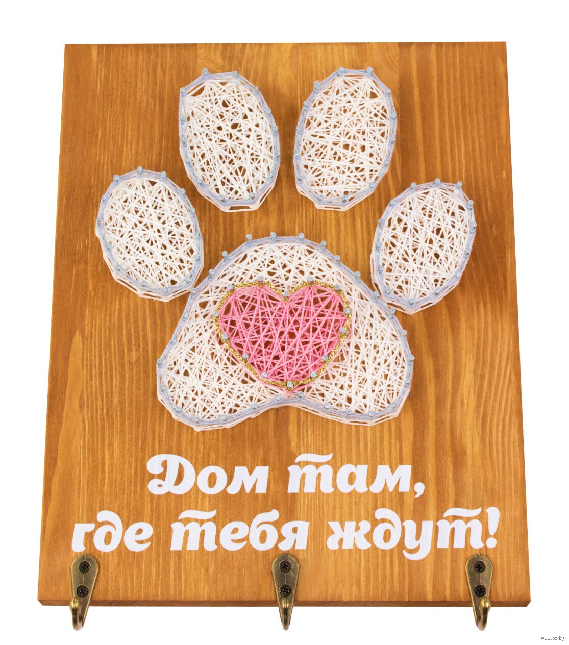 Возьмите молоток в руки. Об остальном позаботились мы, создавая набор с любовью и заботой о вас. Основа сделана из массива сосны, намечены отверстия для гвоздей. Гвозди с запасом. Для их вбивания есть специальный держатель для безопасности во время работы и регулировки гвоздей в один уровень. Красочные нитки намотаны на катушки. Золотистый шнур дарит нежные блики готовой картине.