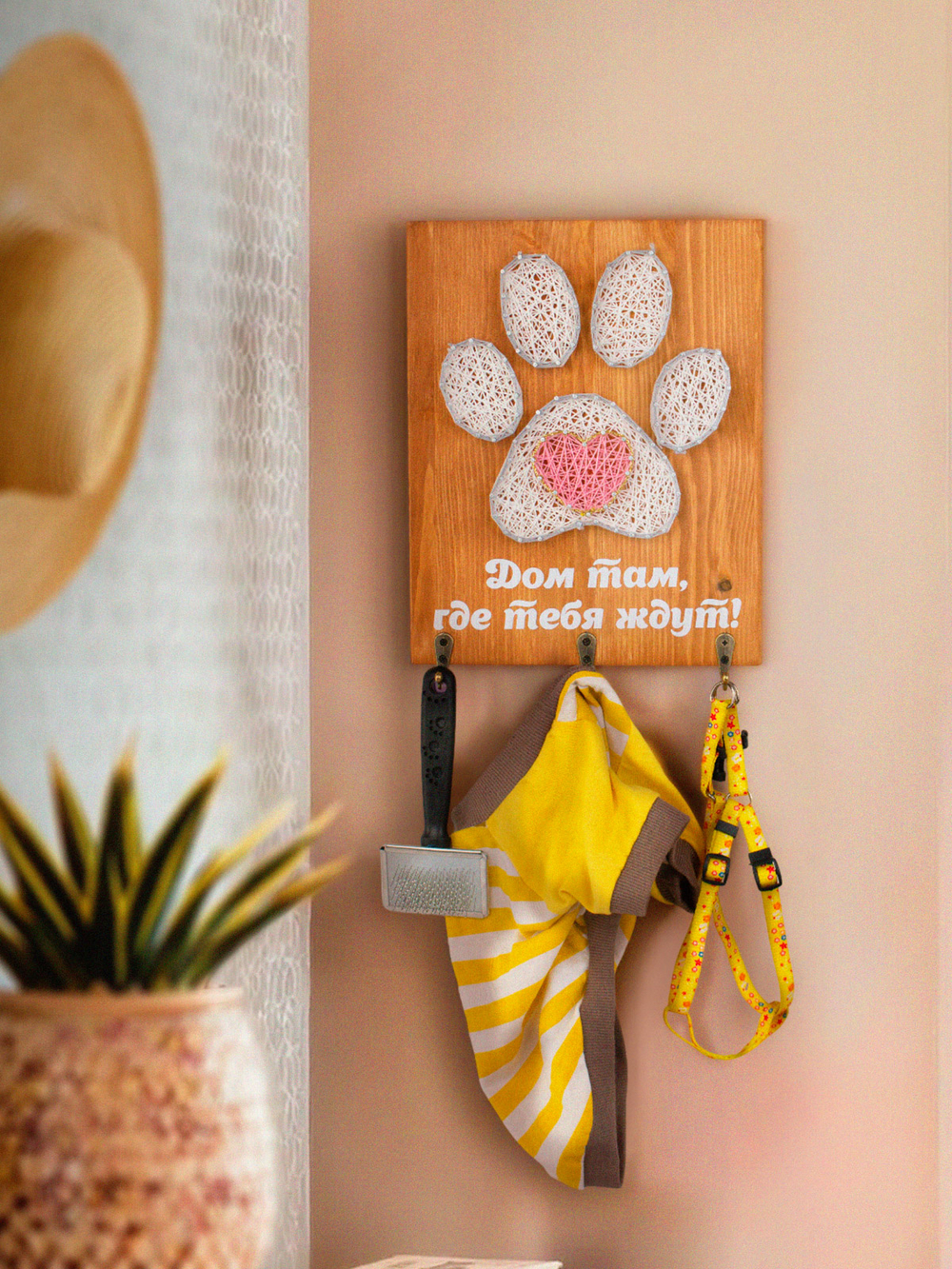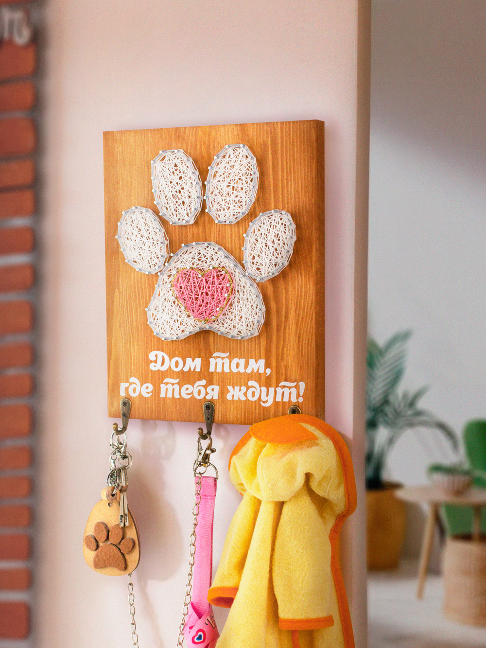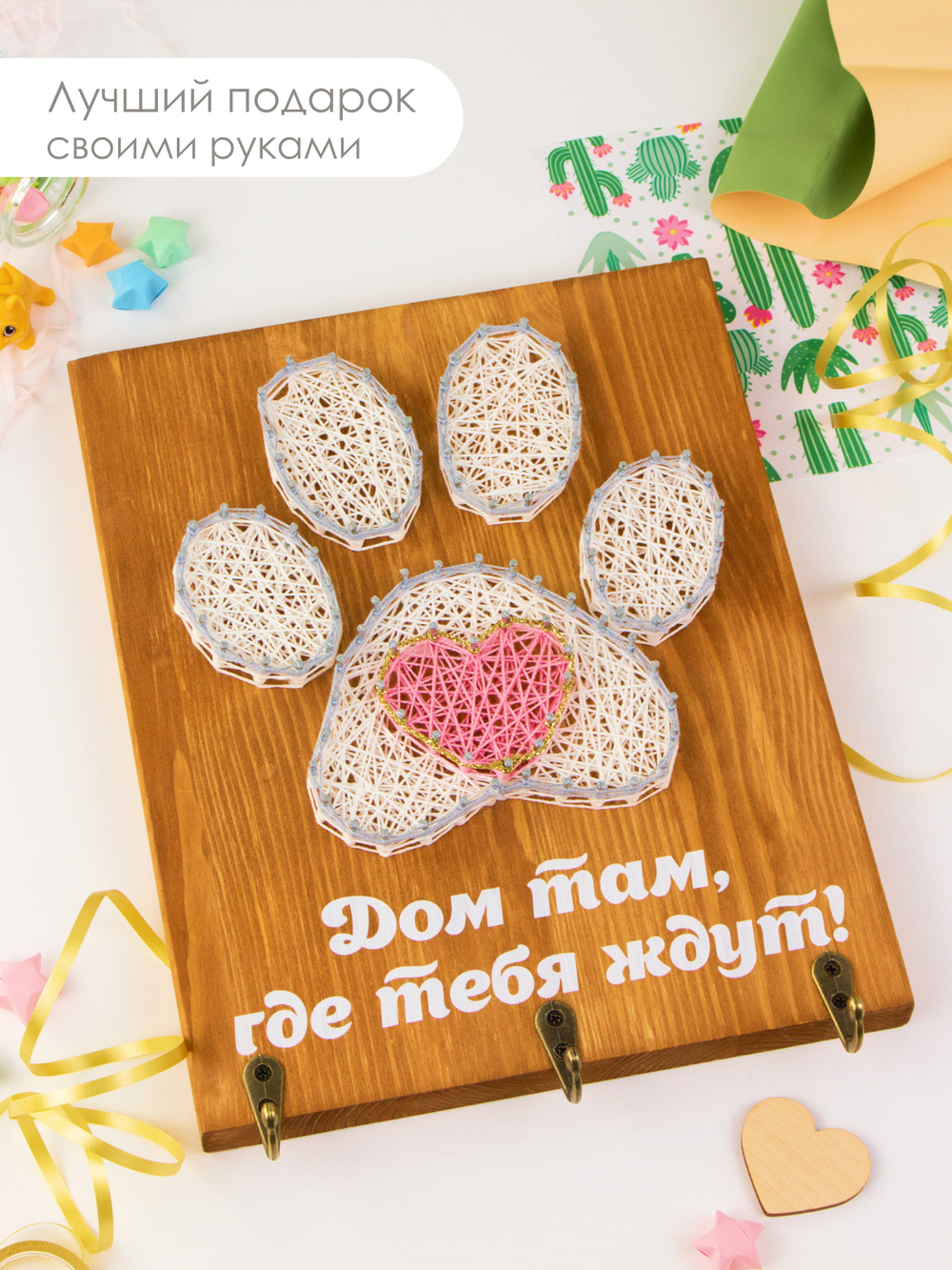 Прищепки для фотографий превращают картину в фото панно с воспоминаниями о ваших ярких моментах. В комплекте стринг-арт набора есть подставка для размещения на столе или полке. Чтобы повесить панно для фото на стену, в деревянной основе предусмотрены отверстия.