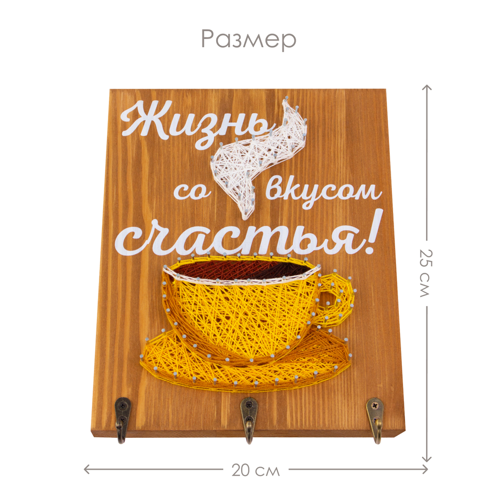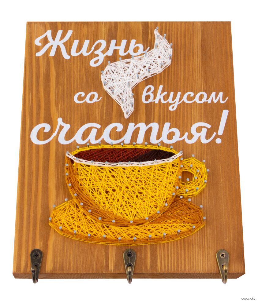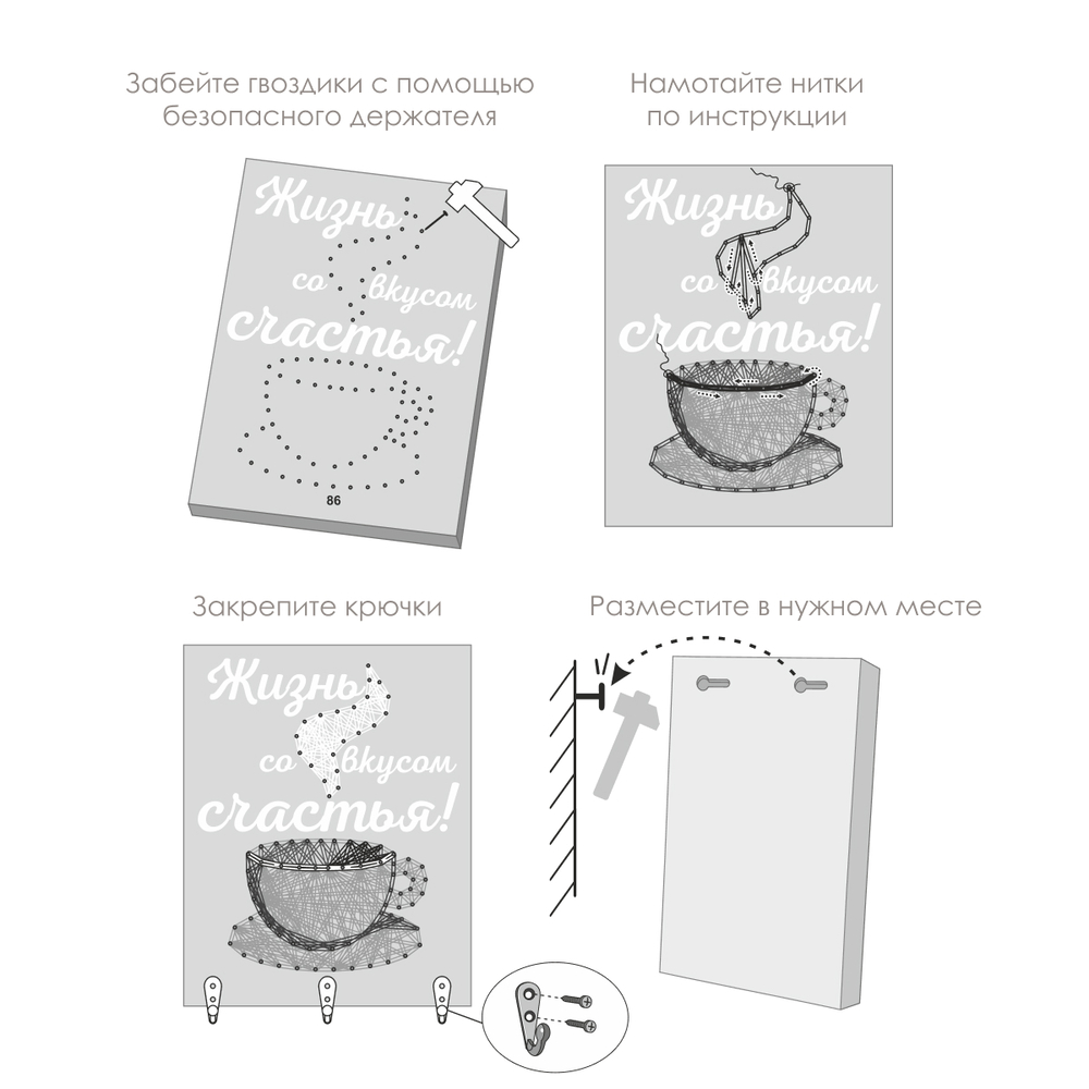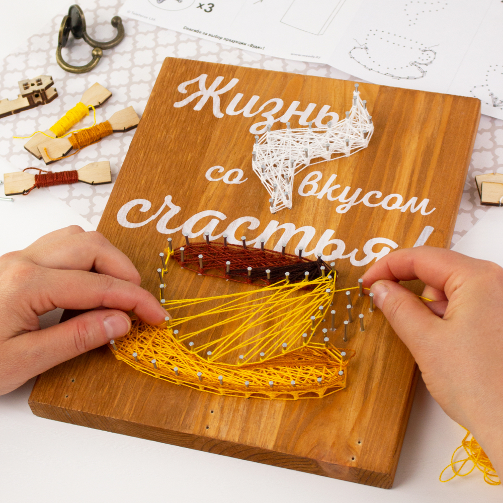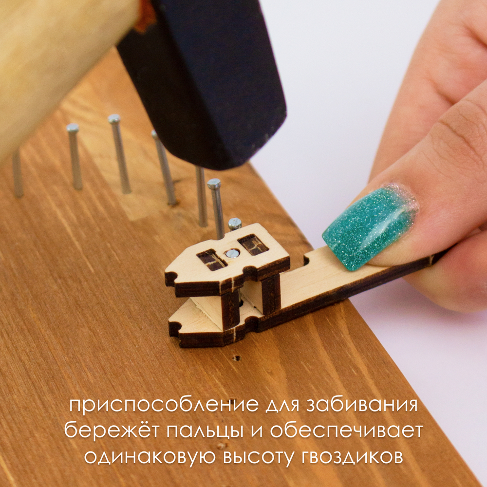 Возьмите молоток в руки. Об остальном позаботились мы, создавая набор с любовью и заботой о вас. Основа сделана из массива сосны, намечены отверстия для гвоздей. Гвозди с запасом. Для их вбивания есть специальный держатель для безопасности во время работы и регулировки гвоздей в один уровень. Красочные нитки намотаны на катушки. Золотистый шнур дарит нежные блики готовой картине.