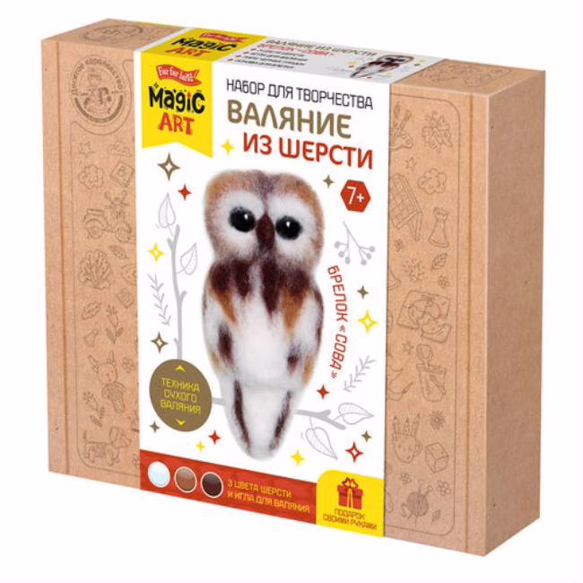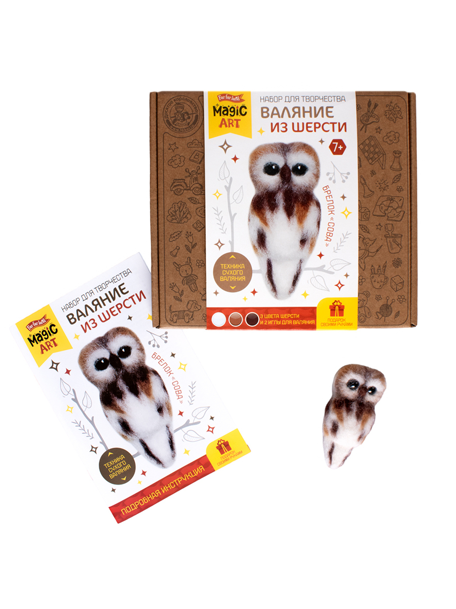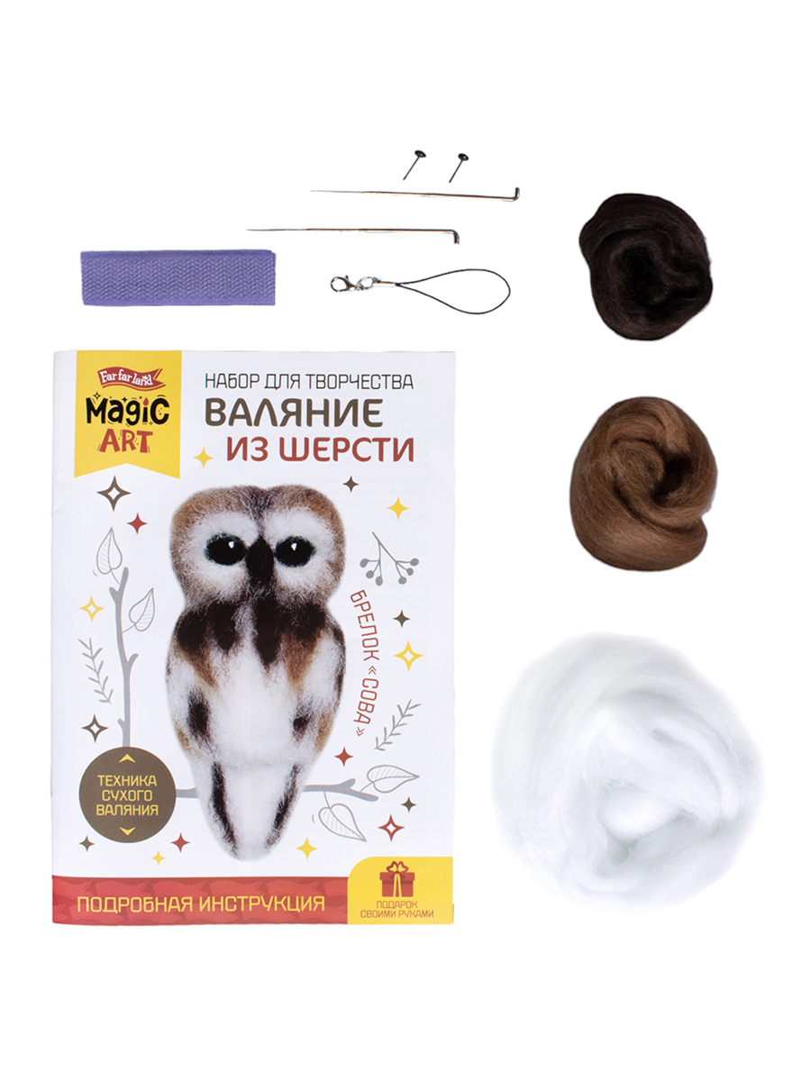 Набор для валяния "Сова" включает все необходимое для создания игрушки или брелока из шерсти.
