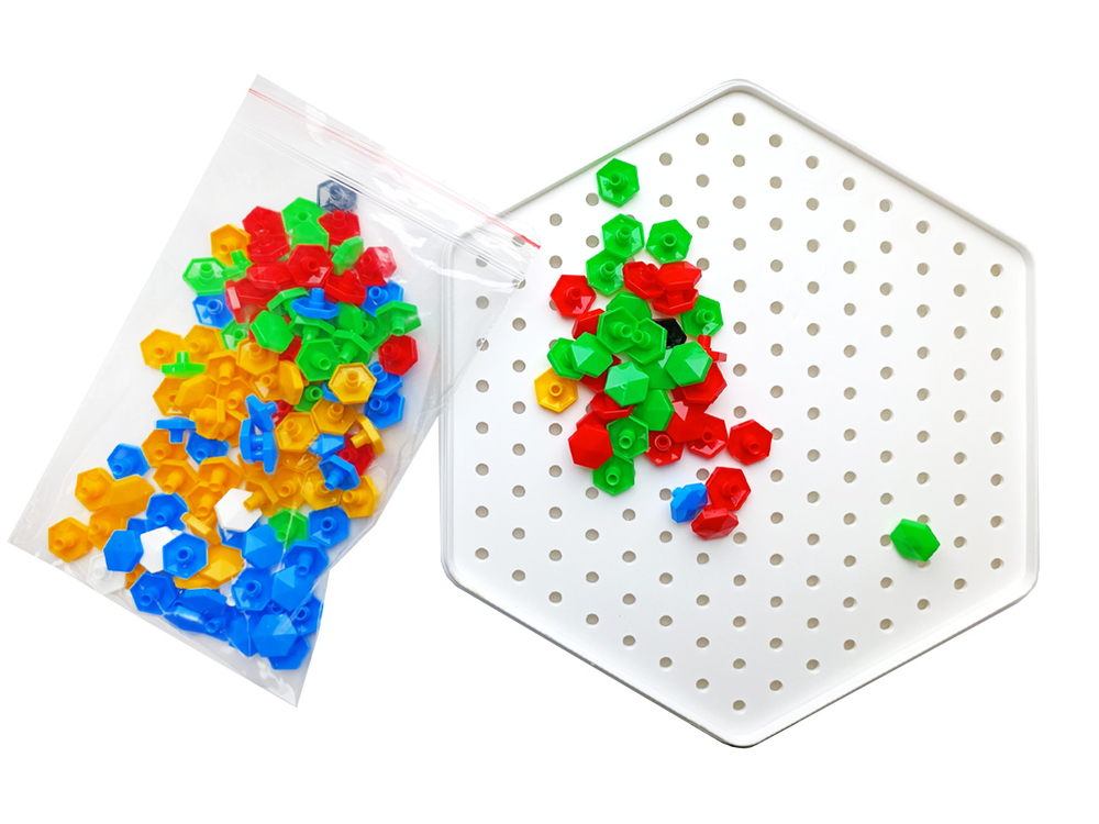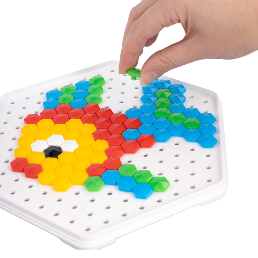 Играя с мозаикой, ребёнок развивает фантазию и творческие навыки, учится усидчивости, тренирует мелкую моторику рук, гибкость пальчиков и щипковый захват, а также учится различать цвета.