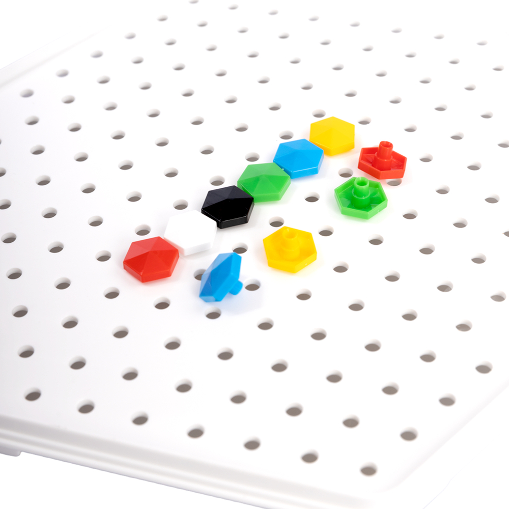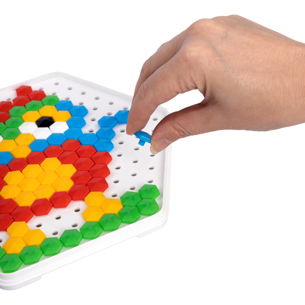 Играя с мозаикой, ребёнок развивает фантазию и творческие навыки, учится усидчивости, тренирует мелкую моторику рук, гибкость пальчиков и щипковый захват, а также учится различать цвета.