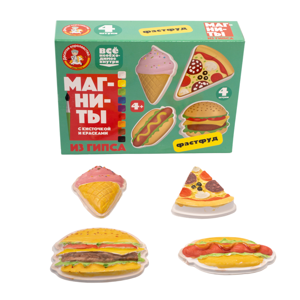 Набор магниты из гипса под роспись "Фастфуд" – это возможность для детей своими руками изготовить магнит, следуя пошаговой инструкции, и получить оригинальный вариант для подарка.
