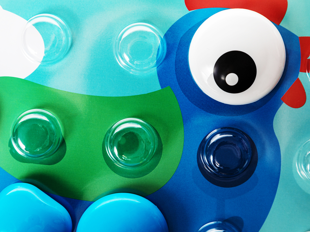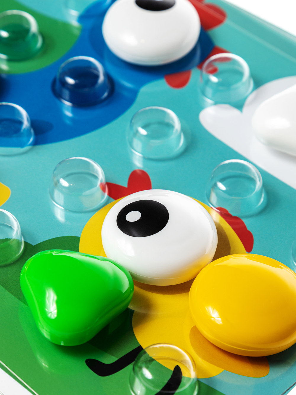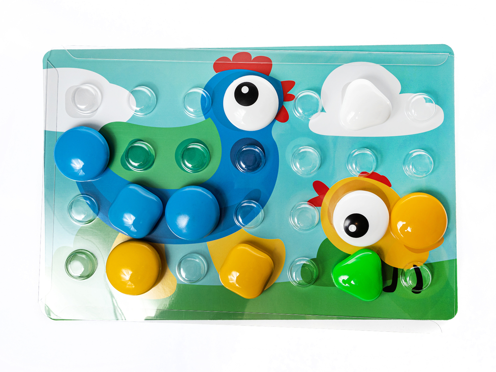 Перед началом игры необходимо вставить картинку, которую хочет собрать малыш, в игровую плату. Разместите плату перед ребёнком и разложите вокруг фишки разных цветов.