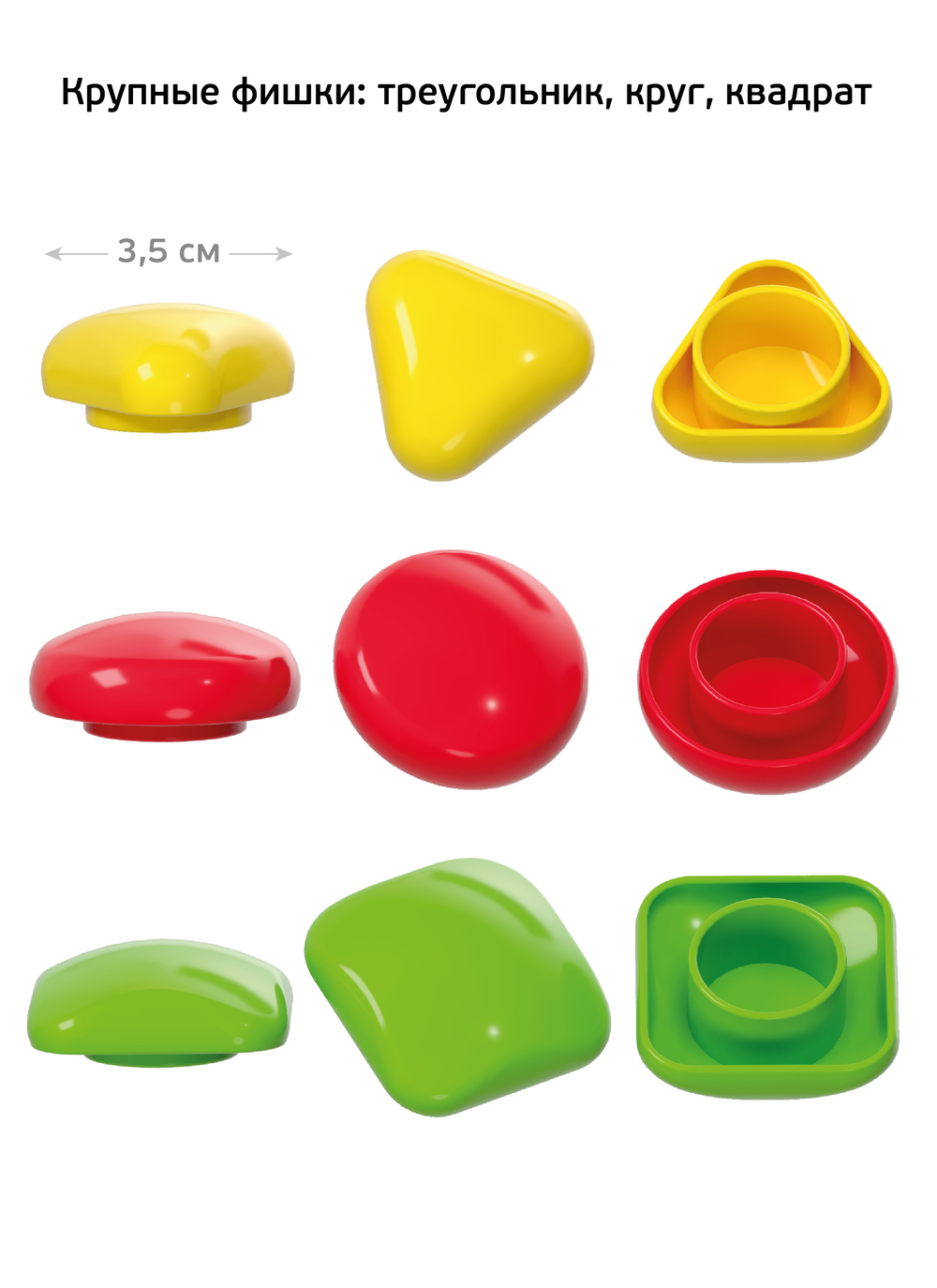 Фишки имеют крупный размер и сглаженную форму, благодаря чему игра будет безопасной для ребёнка.