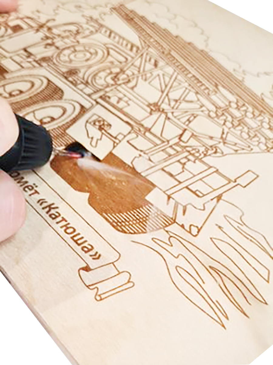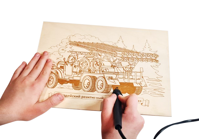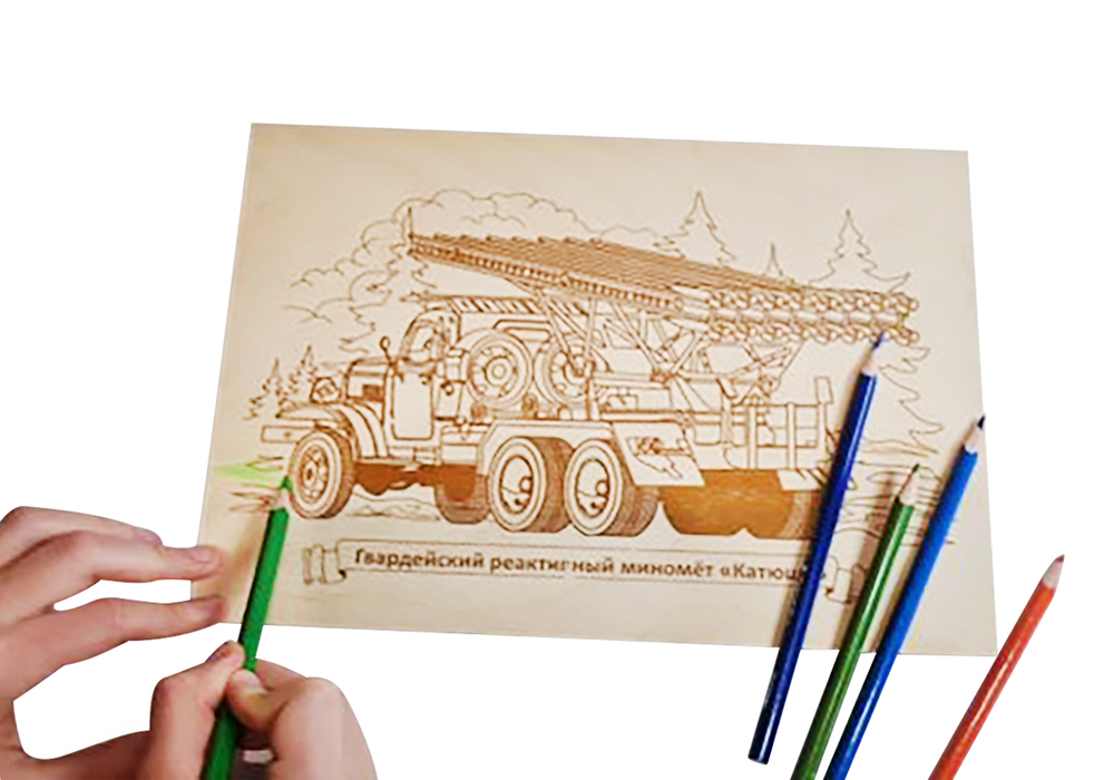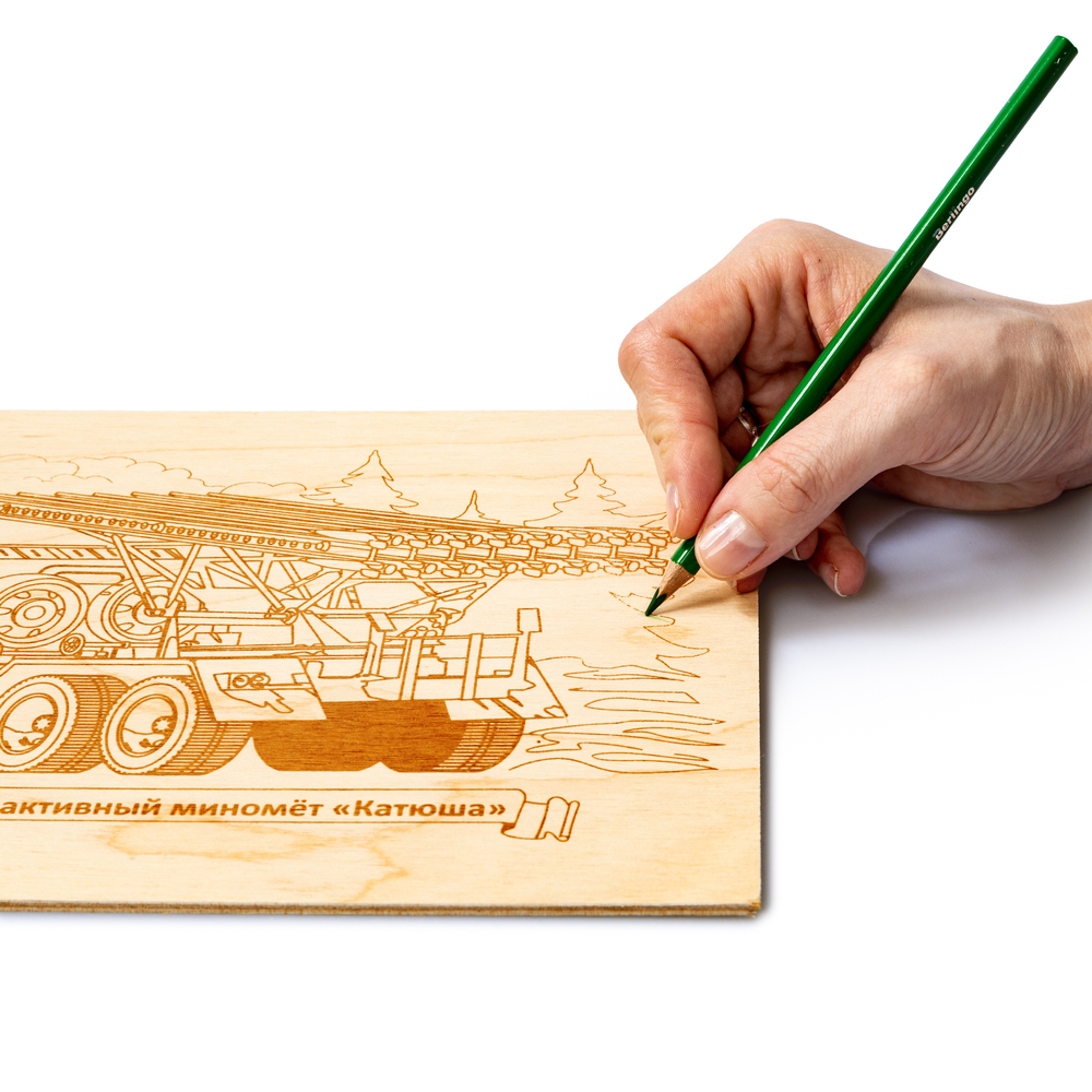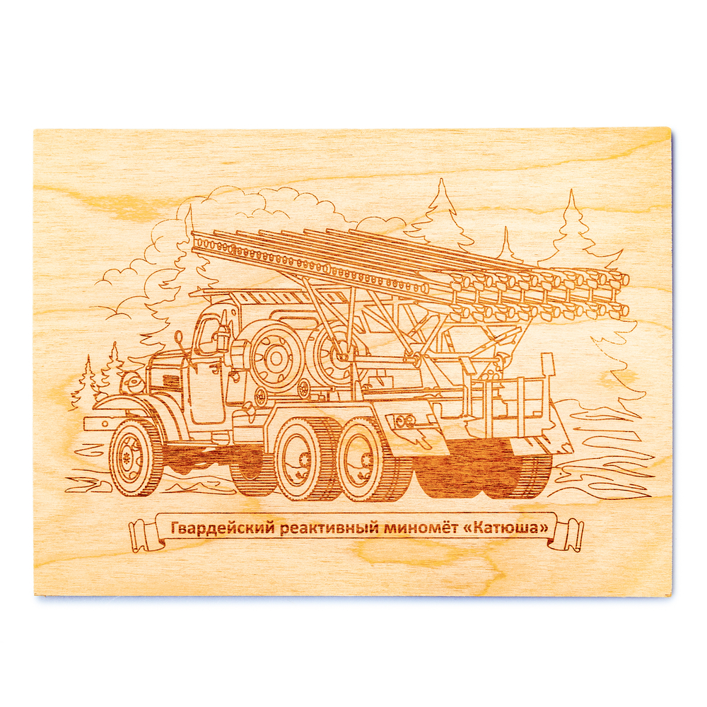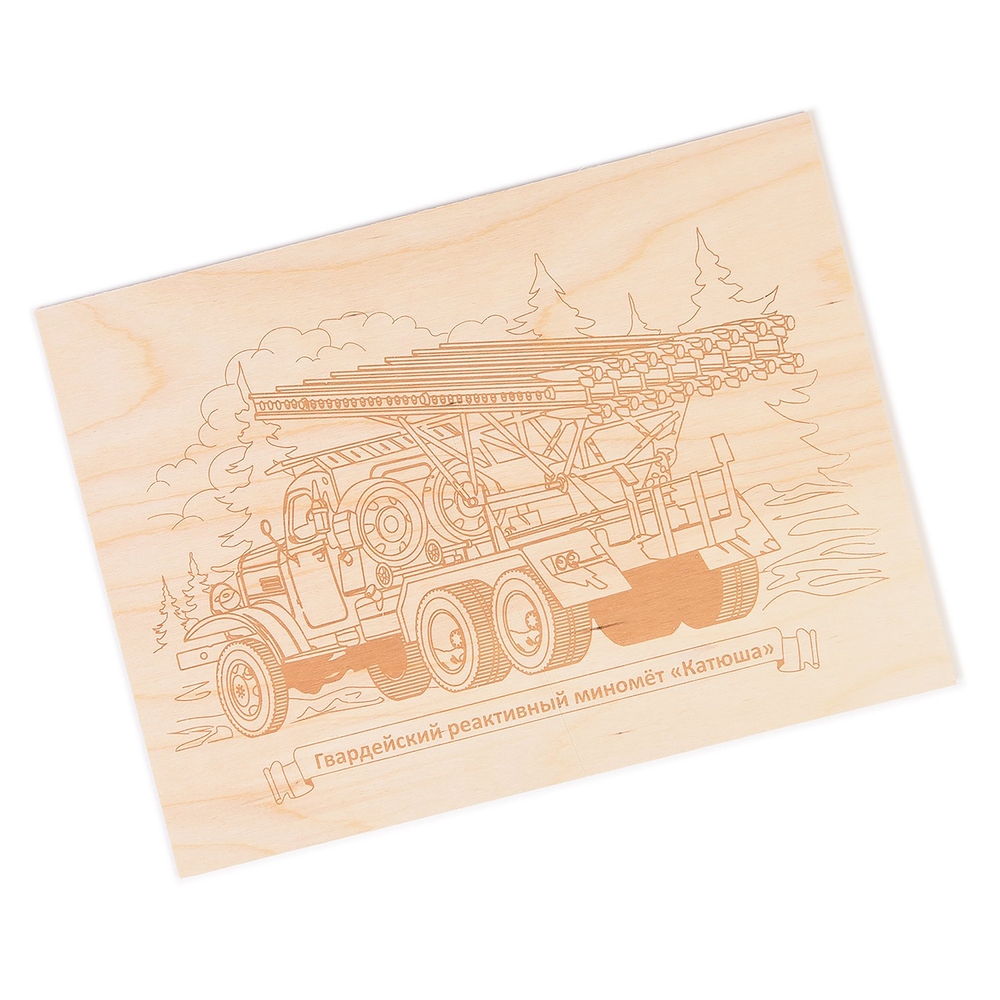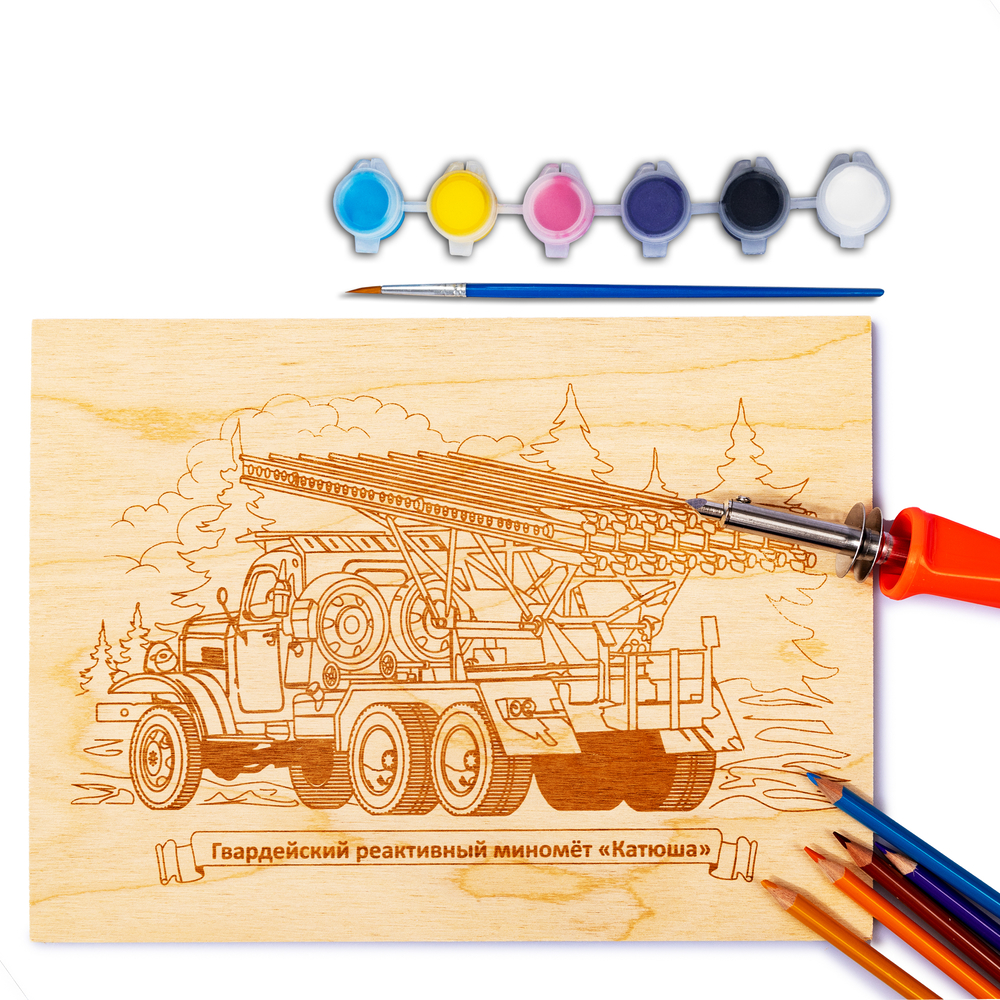 С данной доской ваш ребёнок сможет выжечь картинку, на которой изображён миномёт "Катюша" – советская гвардейская реактивная боевая машина.