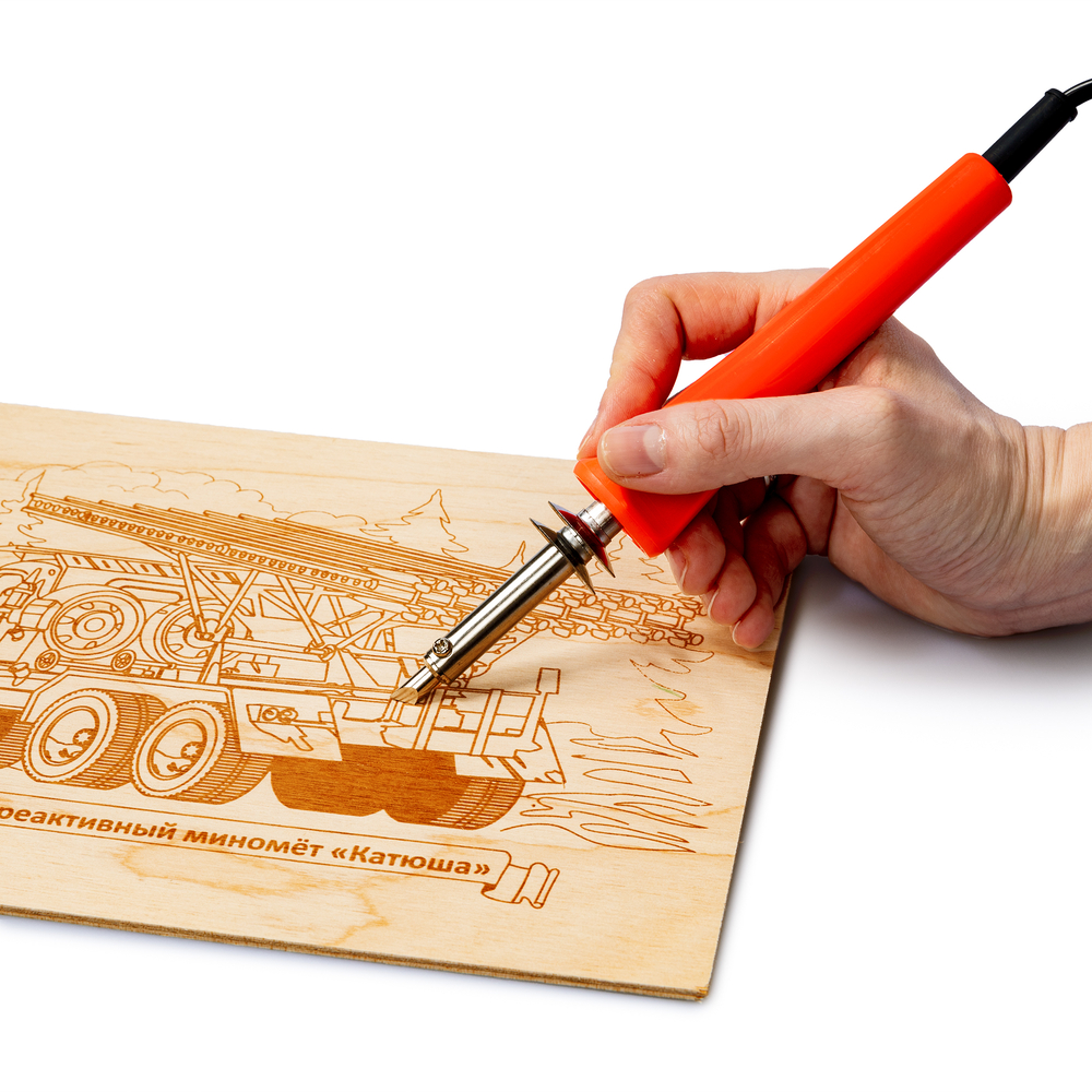 Создайте красивую иллюстрацию советской боевой машины на дереве в технике пирография с доской для выжигания "Гвардейский реактивный миномёт: Катюша".