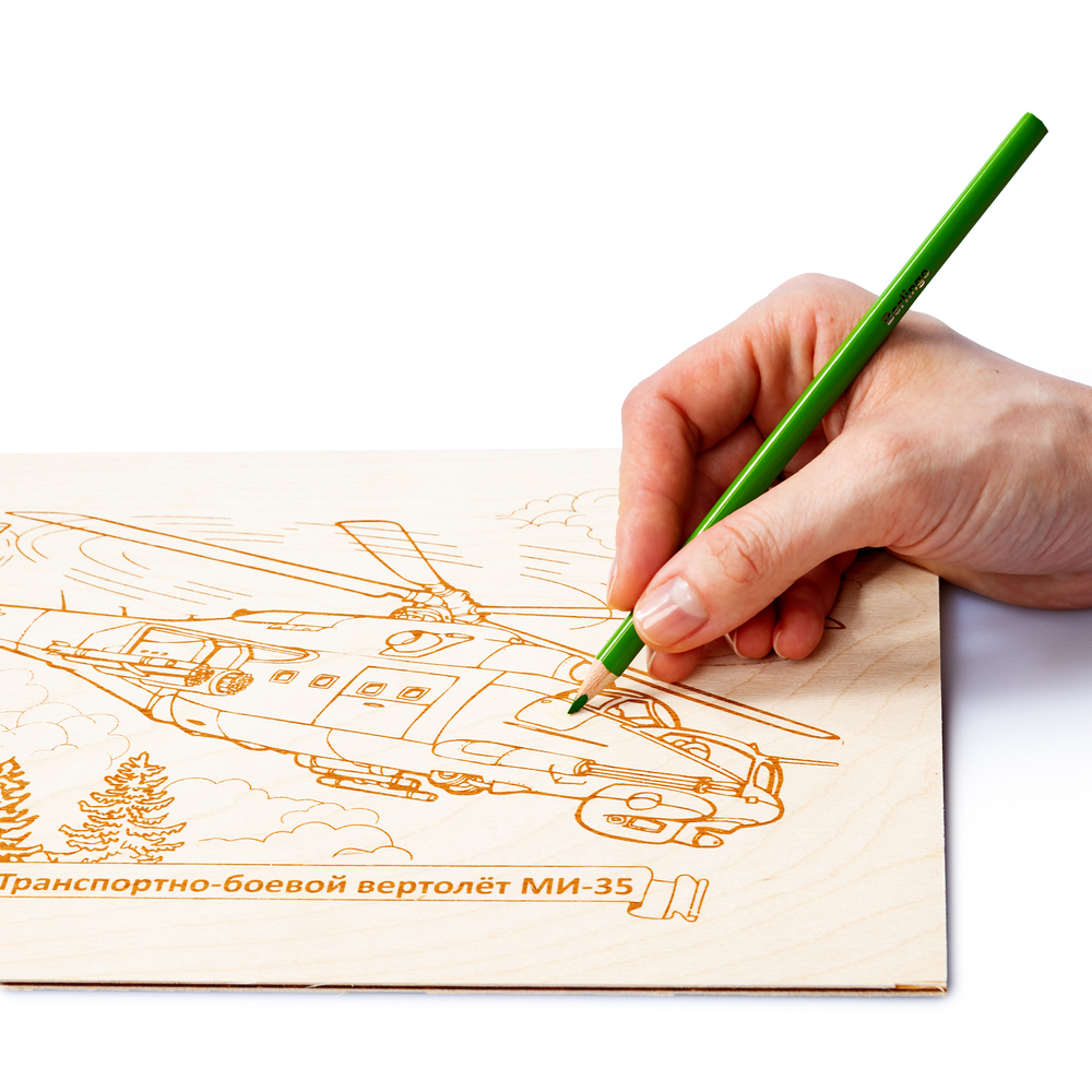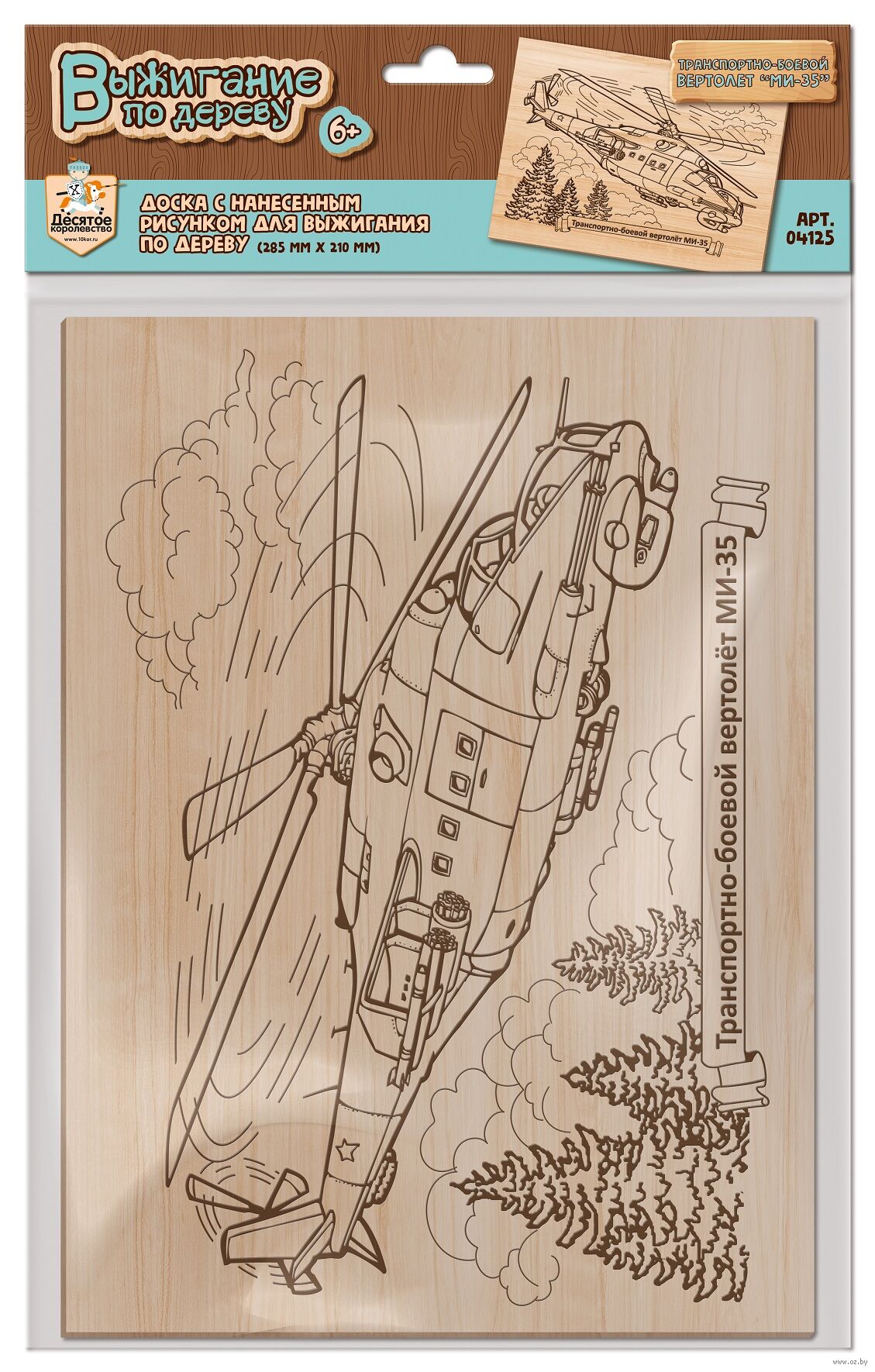 С данной доской ваш ребёнок сможет выжечь картинку, на которой изображён вертолёт М-35 – российский транспортно-боевой вертолёт.