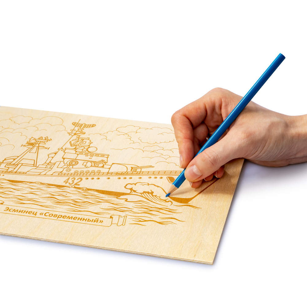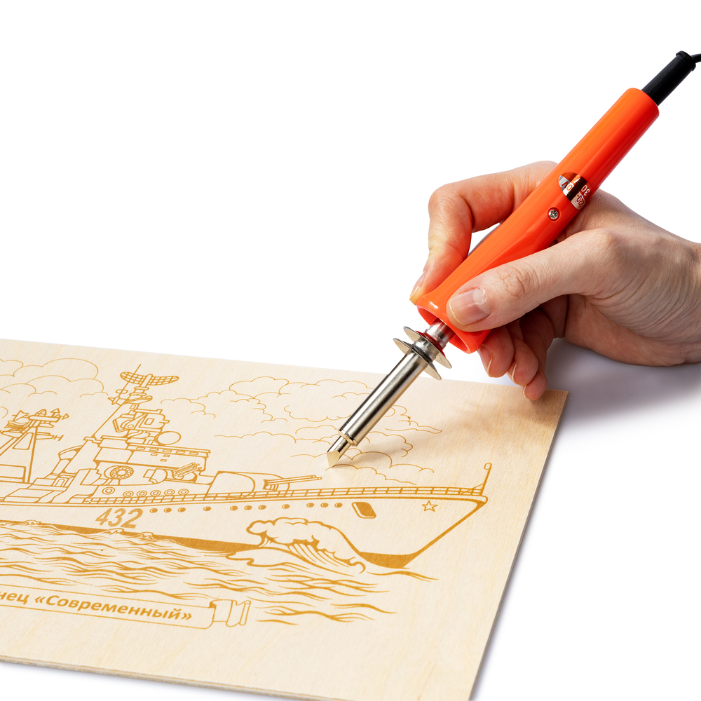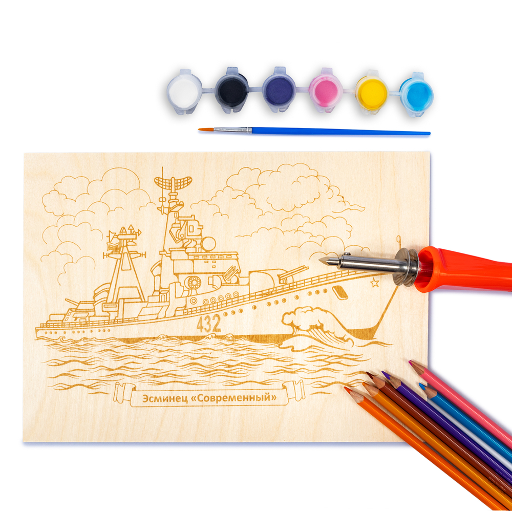 Создайте красивую иллюстрацию военного корабля на дереве в технике пирография с доской для выжигания «Эсминец: Современный».