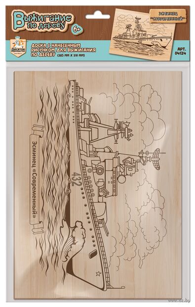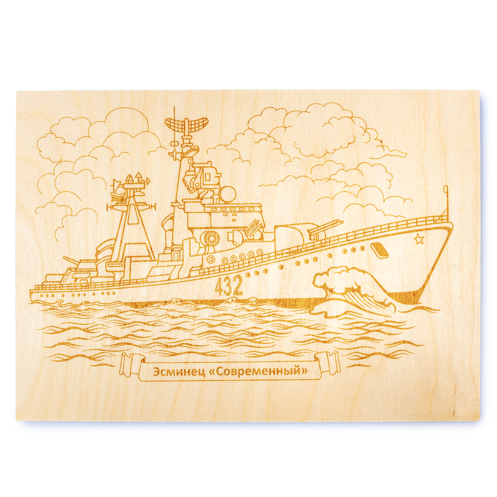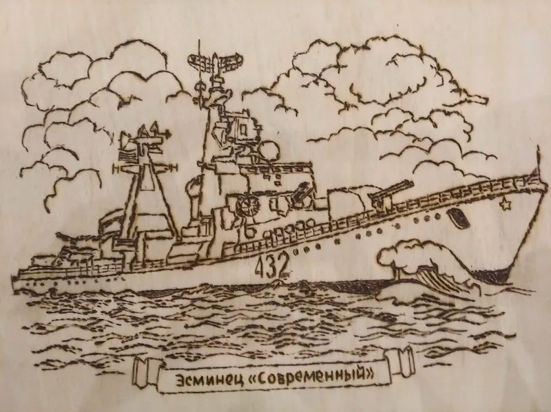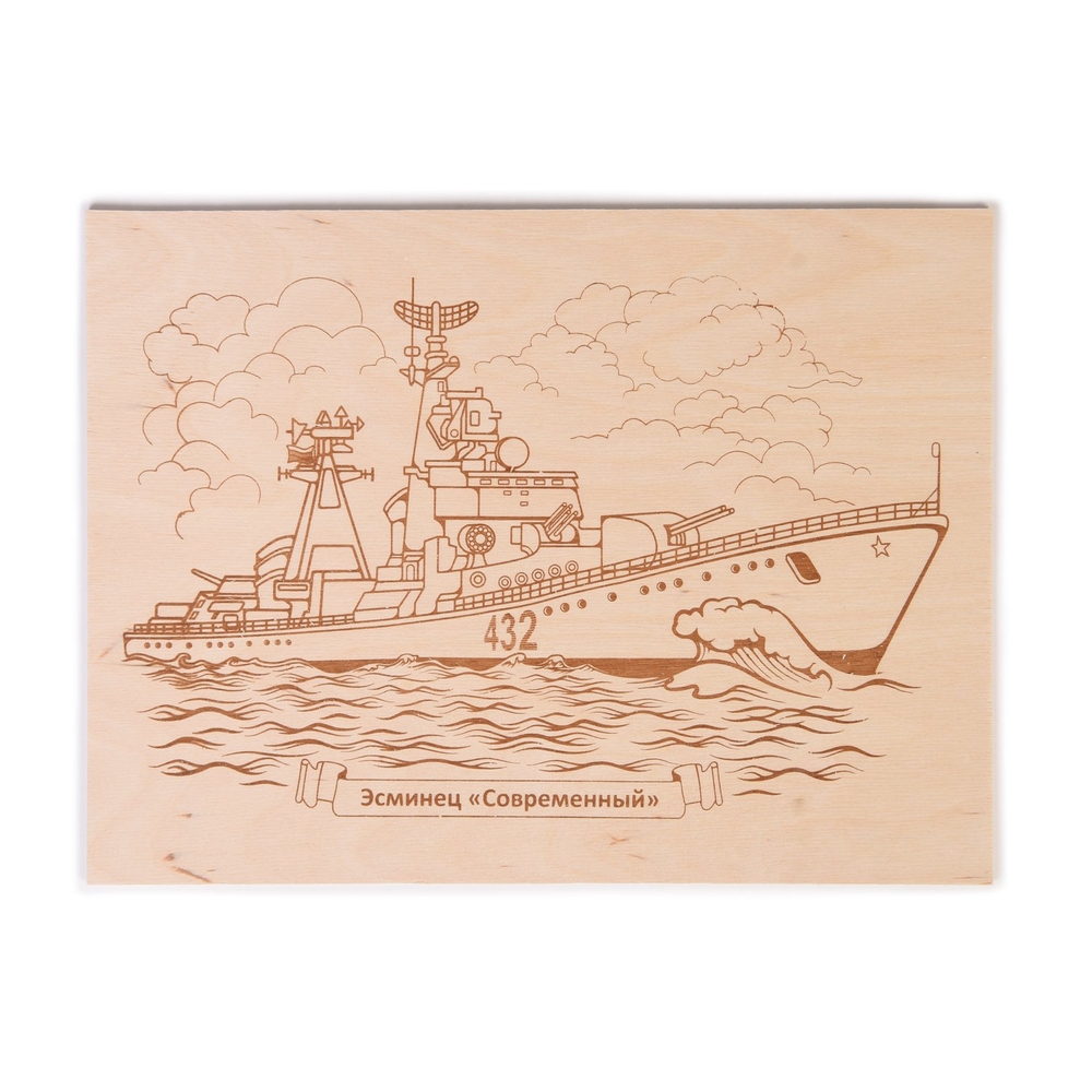 С данной доской ваш ребёнок сможет выжечь картинку, на которой изображён эсминец "Современный" – головной эскадренный миноносец ВМФ СССР и Российской Федерации.