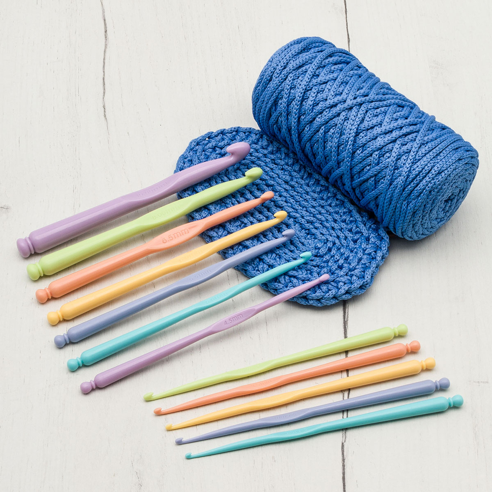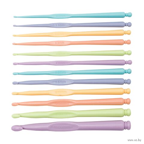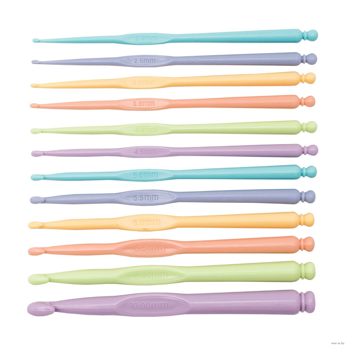 В наборе вы найдете разноцветные пластиковые крючки разных размеров: от 2 до 10 мм. Такой набор позволяет создавать вязаные изделия из разнообразных материалов: натуральной шерсти, мягкого акрила, смесового волокна.