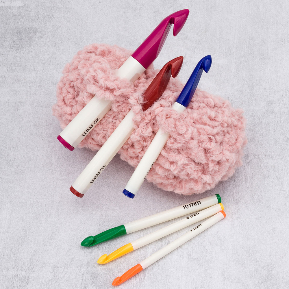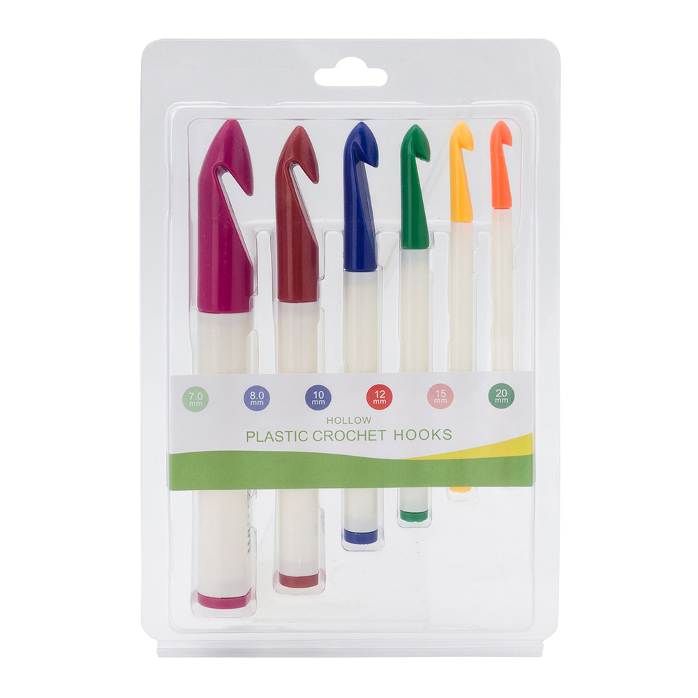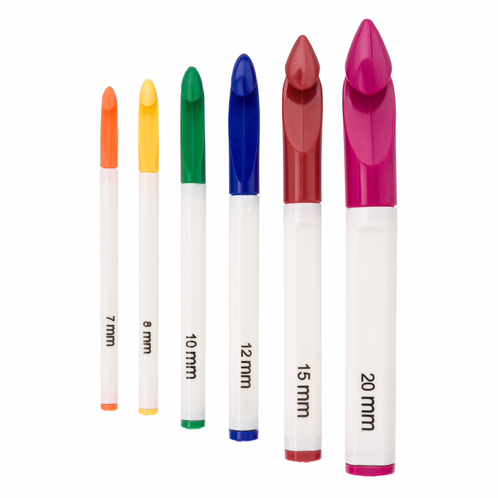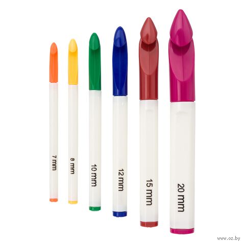 В комплект входят крючки диаметром 7, 8, 10, 12, 15 и 20 миллиметров – всё, что нужно для разнообразных творческих проектов. Размер нанесен на ручку крючка. У каждого размера – свой цвет. Такой набор станет прекрасным подарком для всех, кто увлекается рукоделием и вязанием.