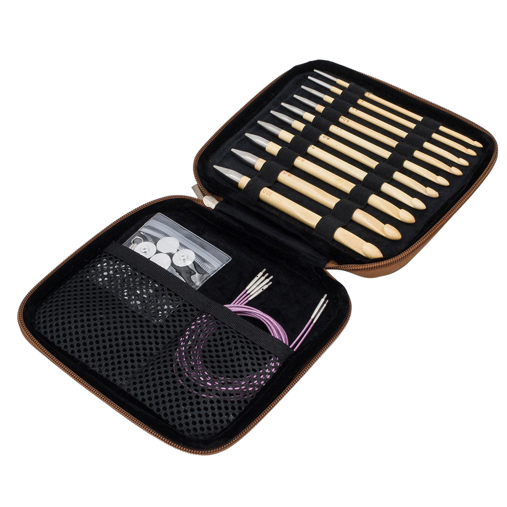 Инструменты сохраняют фактуру и ворс даже на деликатной премиальной шерсти. Они не электризуются, даже если к пряже добавлено синтетическое волокно. Металлический наконечник с обратной стороны слегка закруглен, чтобы не допустить травмирования. В комплекте есть сменные тросики – комбинируйте их с любыми крючками из набора. Кроме того, в наборе вы найдете заглушки, ключики и коннекторы для тросика. Все вязальные принадлежности компактно упакованы в чехол на молнии, который легко брать с собой в дорогу или на мастер-классы.