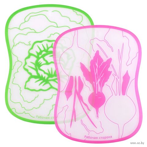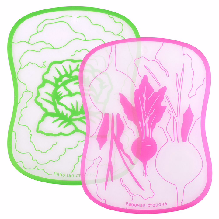 Приятный дизайн изделия дополнит интерьер помещения. Изделие выполнено в 2-х вариантах – салатовом и свекольном. На каждом изделии подписана рабочая сторона, на которой нужно резать продукты. После использования доски рекомендуется тщательно помыть мягкой губкой с использованием моющих средств. Изготовлена из пластмассы (полипропилен).