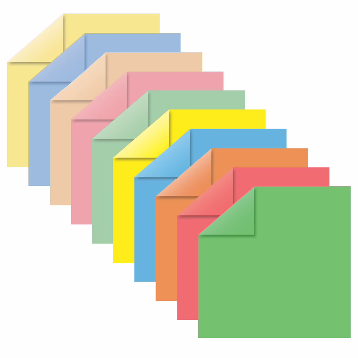 В набор входит 100 листов цветной бумаги для оригами размером 210х210 мм по 10 листов каждого цвета. Цветовая палитра – 10 цветов: 5 пастельных и 5 интенсивных тонов.