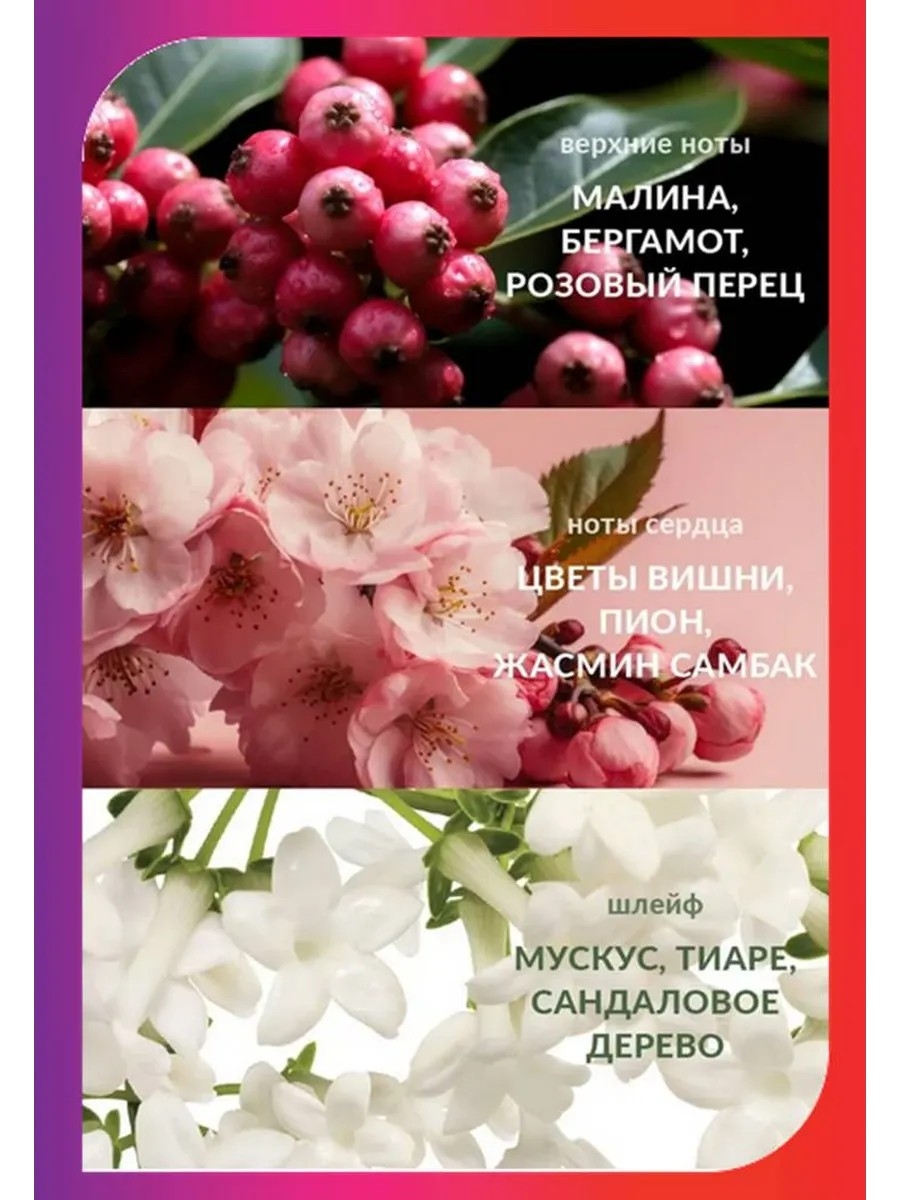Обладает цветочно-фруктово-древесным ароматом с нотами розового перца, цветов вишни и тиаре.