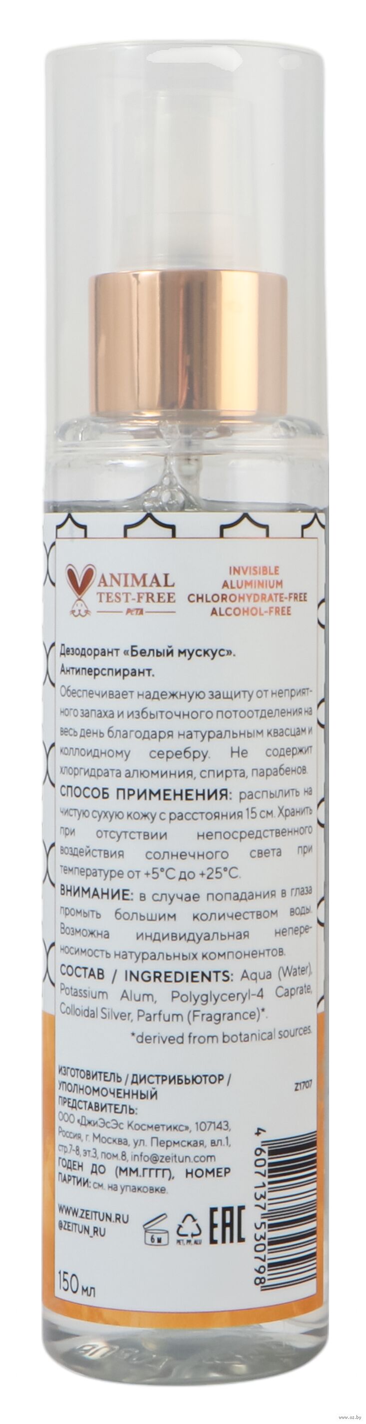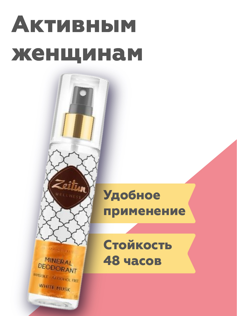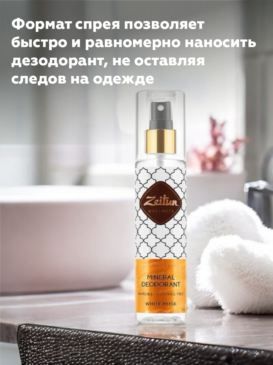 Натуральный минеральный дезодорант-антиперспирант "Белый мускус" от Зейтун обеспечит надежную защиту от пота и неприятного запаха.