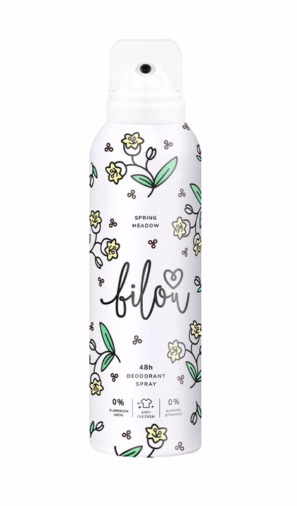 Дезодорант-спрей bilou "Spring Meadow" с ароматом ландыша, жасмина и персика надежно защищает от запаха пота до 48 часов и дарит длительное ощущение свежести, не оставляя пятен на одежде.