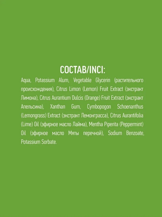 Aqua, Potassium Alum, Glycerin, Citrus Limonium Extract (экстракт Лимона), Citrus Aurantifolia Oil (эфирное масло Лайма), Citrus Aurantium Extract (экстракт Апельсина), Xanthan Gum, Cymbopogon Citratus oil (масло Лемонграсса), Mentra Piperita Oil (эфирное масло Мяты).