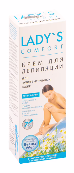 Крем для депиляции LADY'S COMFORT быстро и эффективно удаляет нежелательные волосы, не вызывая раздражений, благодаря увлажняющему комплексу «Beauty Wet», который успокаивает и смягчает кожу, предотвращает врастание волос. Результат: необычайно гладкая кожа!