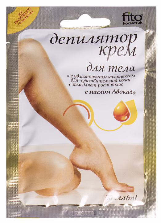 Крем-депилятор для тела с увлажняющим комплексом для чувствительной кожи содержит масло авокадо, смягчающее и увлажняющее кожу.