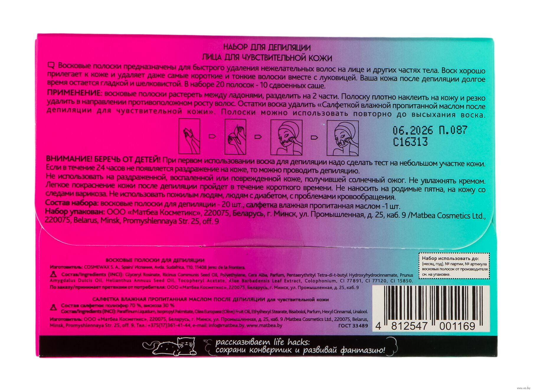 Хана усищам!!!))) Не то чтобы я женский вариант Сталина, но усики уже стали заметны в уголках губ - азиатские корни, шоб их((( Пришлось купить эти полоски. Потому что они дешевые и потому что угольная маска-детокс этой фирмы вполне годная. А еще у них котик на упаковке! Делала все по науке - потестила сначала на кусочке ноги. Вроде ничего не покраснело, не покрылось прыщами и не превратилось в чешую. Назавтра, как положено, почистила фейс в районе боевых действий лосьоном и обработала хлоргексидином. Потом уже налепила и дернула полоску… Было немножко больно, но терпимо (пинцетом намного больнее). Остатки воска легко убрались салфеткой. Кстати, волоски удалились не все. Отдельных вражеских бойцов добивала пинцетом.Еще показалось, что салфетка пропитана чем-то уменьшающим раздражение – краснота ушла почти мгновенно. «Полоски можно использовать повторно до высыхания воска» - явно не про меня. 1. они становятся волосатые, как Зизи-Топ. 2. их тяжело наклеить второй раз. Эффект держится уже третью неделю. Новых проблем с кожей не вылезло. Особых различий с хвалеными Veet не заметила, только витовские стоили как дирижабль. Лично мне полоски подошли хорошо (особенно по цене), поэтому не поленилась накатать длиннопост. Но по-любому всем советую сначала тестировать полоски, а потом лепить на лицо. Так спокойней