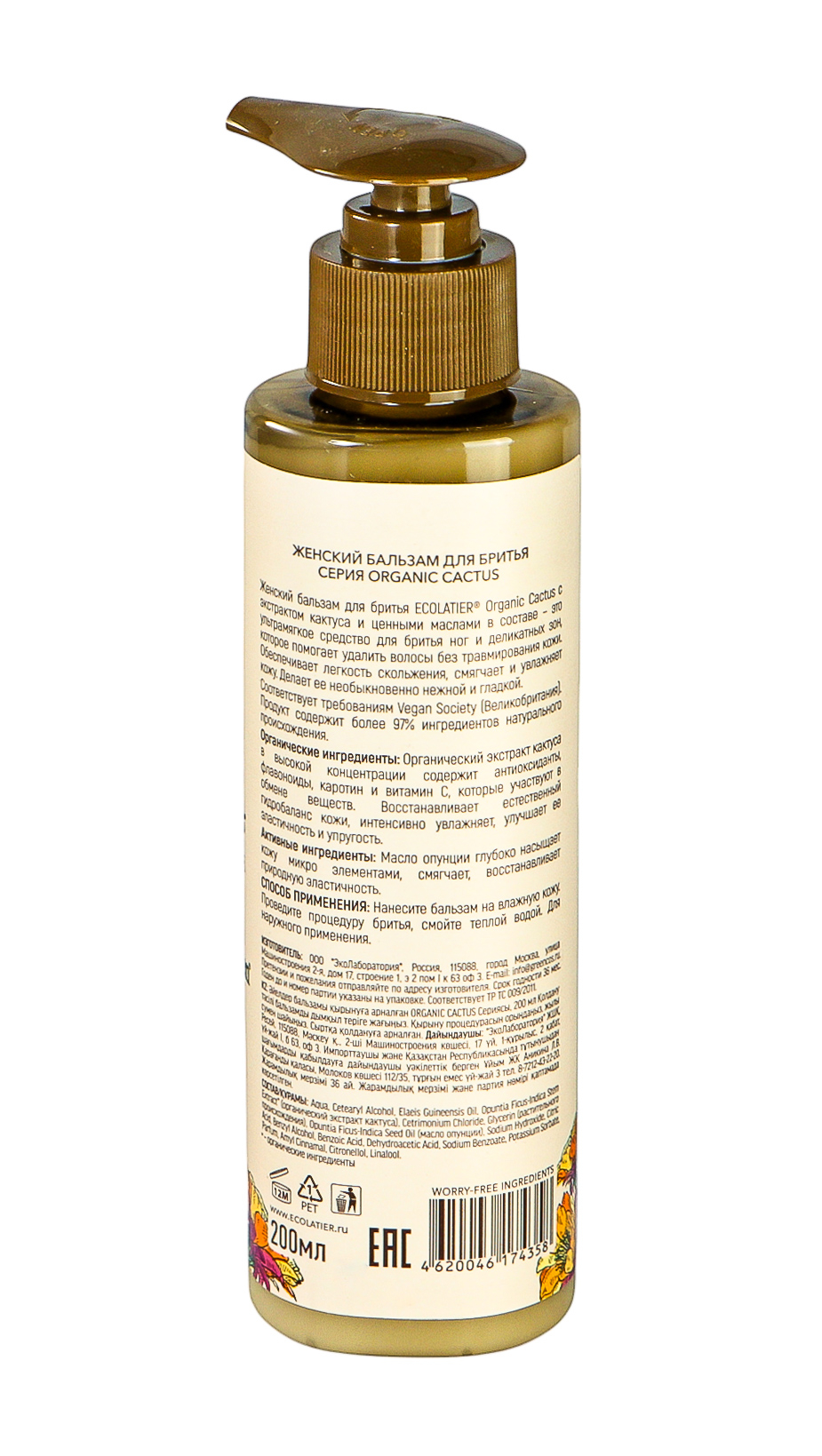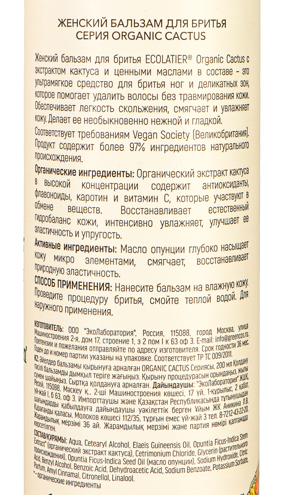Aqua, Organic Cereus Grandiflorus (Cactus) Flower Extract (органический экстракт цветков кактуса), Cetearyl Alcohol, Vegetable Glycerin (растительного происхождения), Elaeis Guineensis (Palm) Oil (масло пальмы), Cetrimonium Chloride, Xanthan Gum, Organic Opuntia Ficus-Indica Seed Oil (органическое масло опунции), Parfum, Benzyl Alcohol, Benzoic Acid, Dehydroacetic Acid, Potassium Sorbate, Sorbic Acid, Sodium Hydroxide, Amyl Cinnamal, Citronellol, Geraniol, Limonene, Linalool.