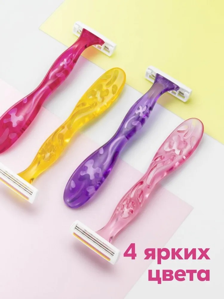 А к тому же вы сможете подобрать цвет бритвы под любое свое настроение: в наборе четыре станка с уникальным цветочным дизайном в двух роскошных оттенках розового, в радужных фиолетовом и желтом.