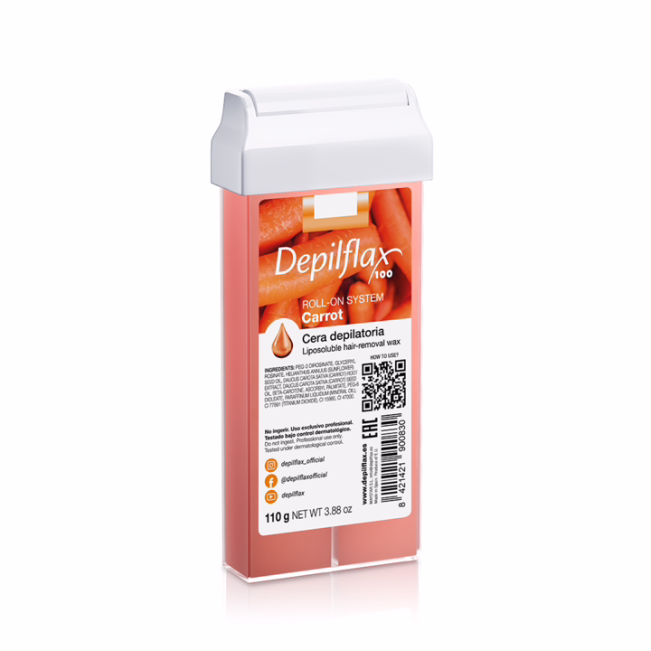 Воск средней плотности от бренда Depilflax100 – "Морковь" в картридже. Подходит для средних и жестких волос.