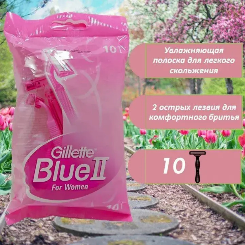 Одноразовые бритвы для женщин Blue II. 2 лезвия обеспечивают чистое бритье. Увлажняющая полоска обеспечивает плавное скольжение и помогает защитить кожу во время бритья.