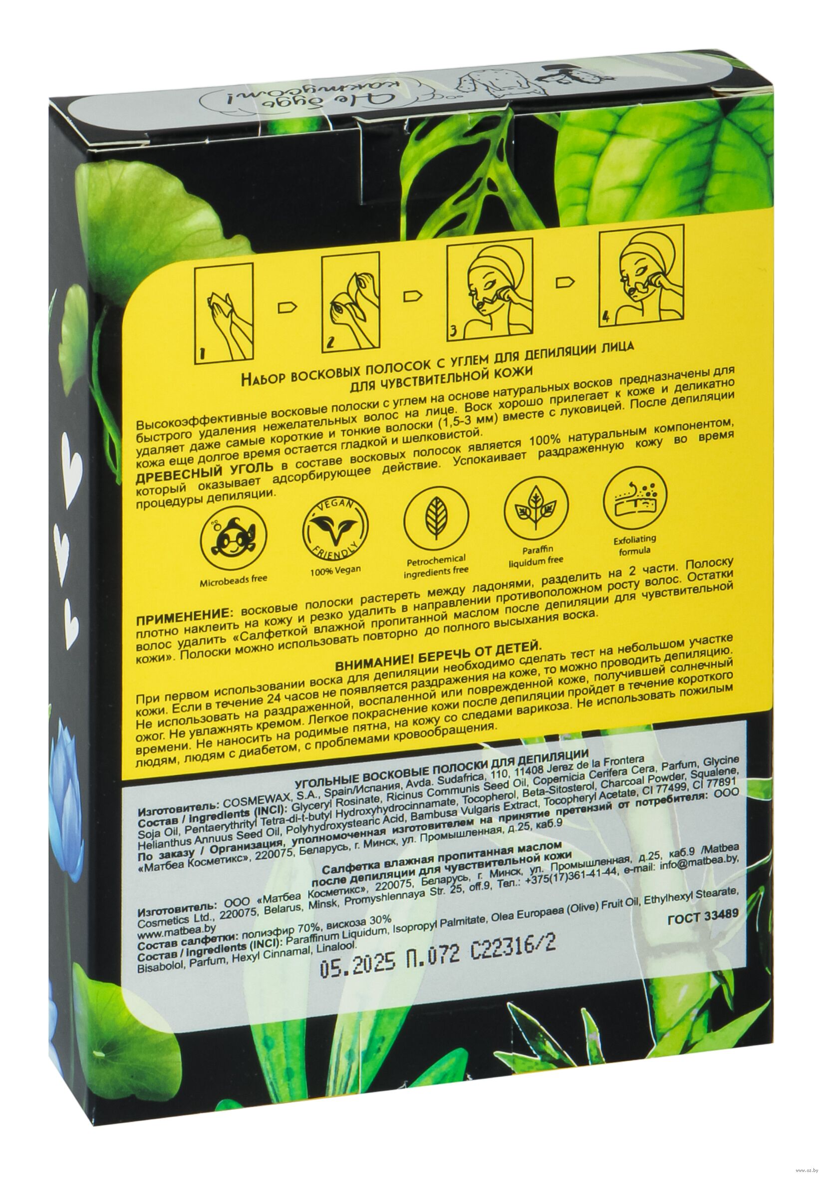 После депиляции кожа еще долгое время остается гладкой и шелковистой. Древесный уголь в составе восковых полосок является 100% натуральным компонентом, который оказывает адсорбирующее действие.
