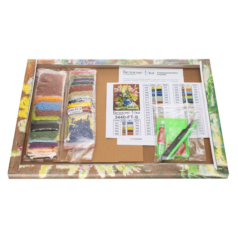 В комплекте есть все необходимое для создания картины, просто откройте набор и можно собирать картину! Удобная для работы основа картины на подрамнике – комфортно собирать, легко размещать. Комплект камней расфасован по цветам в отдельные пакеты с zip-застежкой, на каждом пакете есть наклейка с номером цвета и условным обозначением как на холсте.
