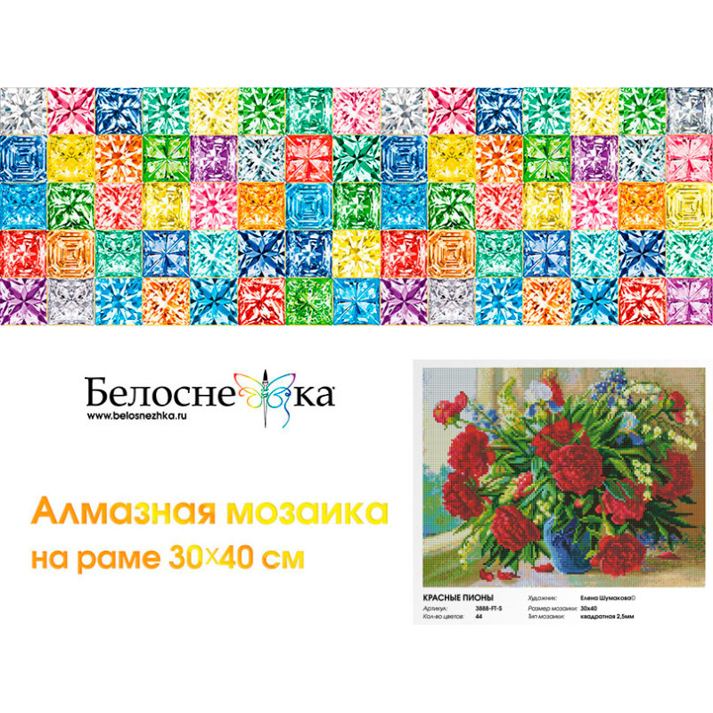 Блестящая картина из квадратных камней. Основа картины – холст, натянутый на подрамник, для придания крепости конструкции подрамник усилен листом оргалита. На холст нанесена цветная схема с контрастными условными обозначениями, схему покрывает высококачественный клеевой слой, сверху слой закрыт пленкой. Комплект квадратных камней расфасован по цветам в отдельные пакеты, на каждом пакете есть наклейка с номером цвета и условным обозначением.