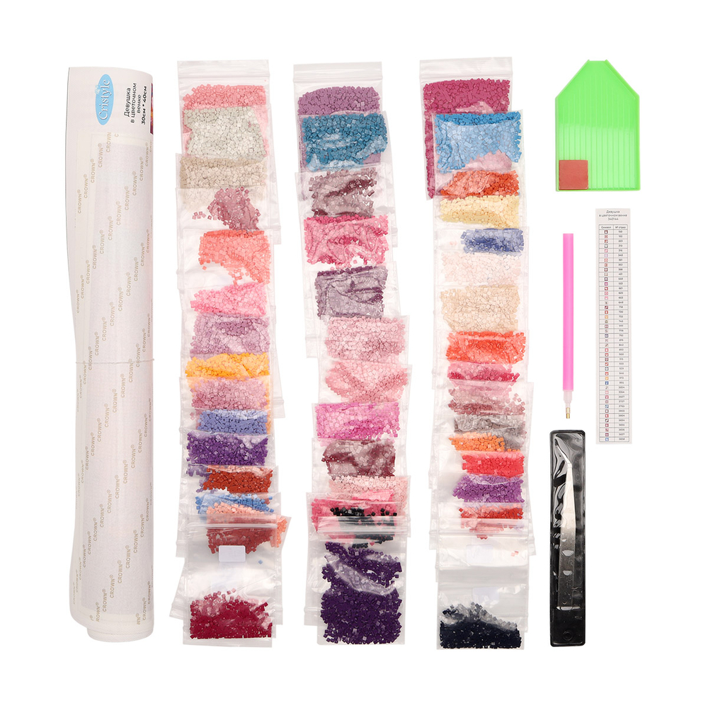 Схема выкладки тщательно проработана, с учетом палитры DMC, поэтому цвета и детали переданы максимально точно. Расшифровка схемы находится прямо на холсте – это поможет быстро подобрать стразы нужного цвета и найти участок, где они будут располагаться. Качественный клеевой слой надежно удерживает стразы на полотне.