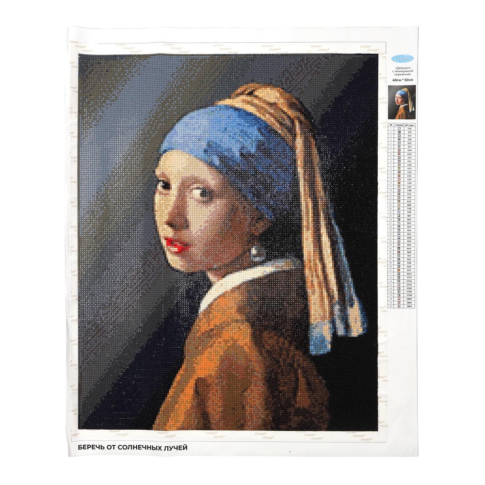 Схема выкладки тщательно проработана, с учетом палитры DMC, поэтому цвета и детали переданы максимально точно. Расшифровка схемы находится прямо на холсте – это поможет быстро подобрать стразы нужного цвета и найти участок, где они будут располагаться. Качественный клеевой слой надежно удерживает стразы на полотне.