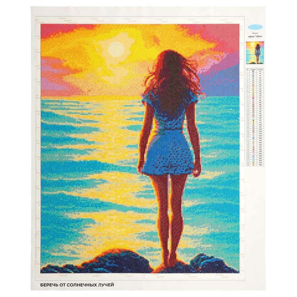Схема выкладки тщательно проработана, с учетом палитры DMC, поэтому цвета и детали переданы максимально точно. Расшифровка схемы находится прямо на холсте – это поможет быстро подобрать стразы нужного цвета и найти участок, где они будут располагаться. Качественный клеевой слой надежно удерживает стразы на полотне.