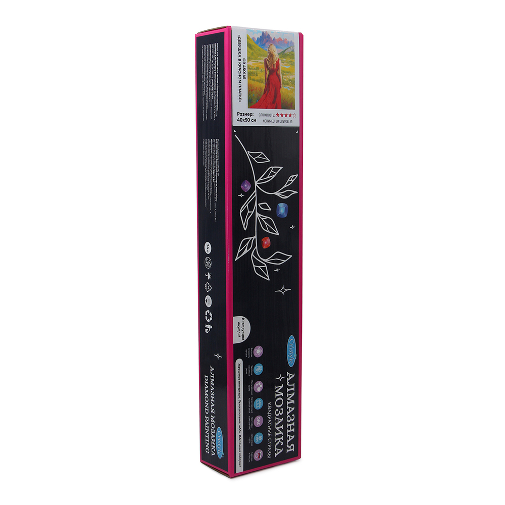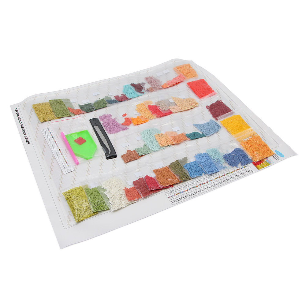 Схема выкладки тщательно проработана, с учетом палитры DMC, поэтому цвета и детали переданы максимально точно. Расшифровка схемы находится прямо на холсте – это поможет быстро подобрать стразы нужного цвета и найти участок, где они будут располагаться. Качественный клеевой слой надежно удерживает стразы на полотне.