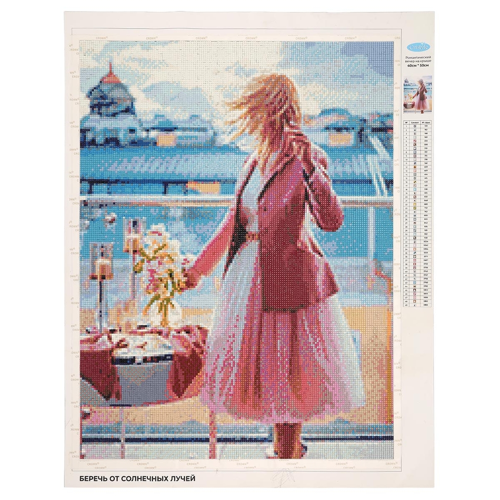 Схема выкладки тщательно проработана, с учетом палитры DMC, поэтому цвета и детали переданы максимально точно. Расшифровка схемы находится прямо на холсте – это поможет быстро подобрать стразы нужного цвета и найти участок, где они будут располагаться. Качественный клеевой слой надежно удерживает стразы на полотне.