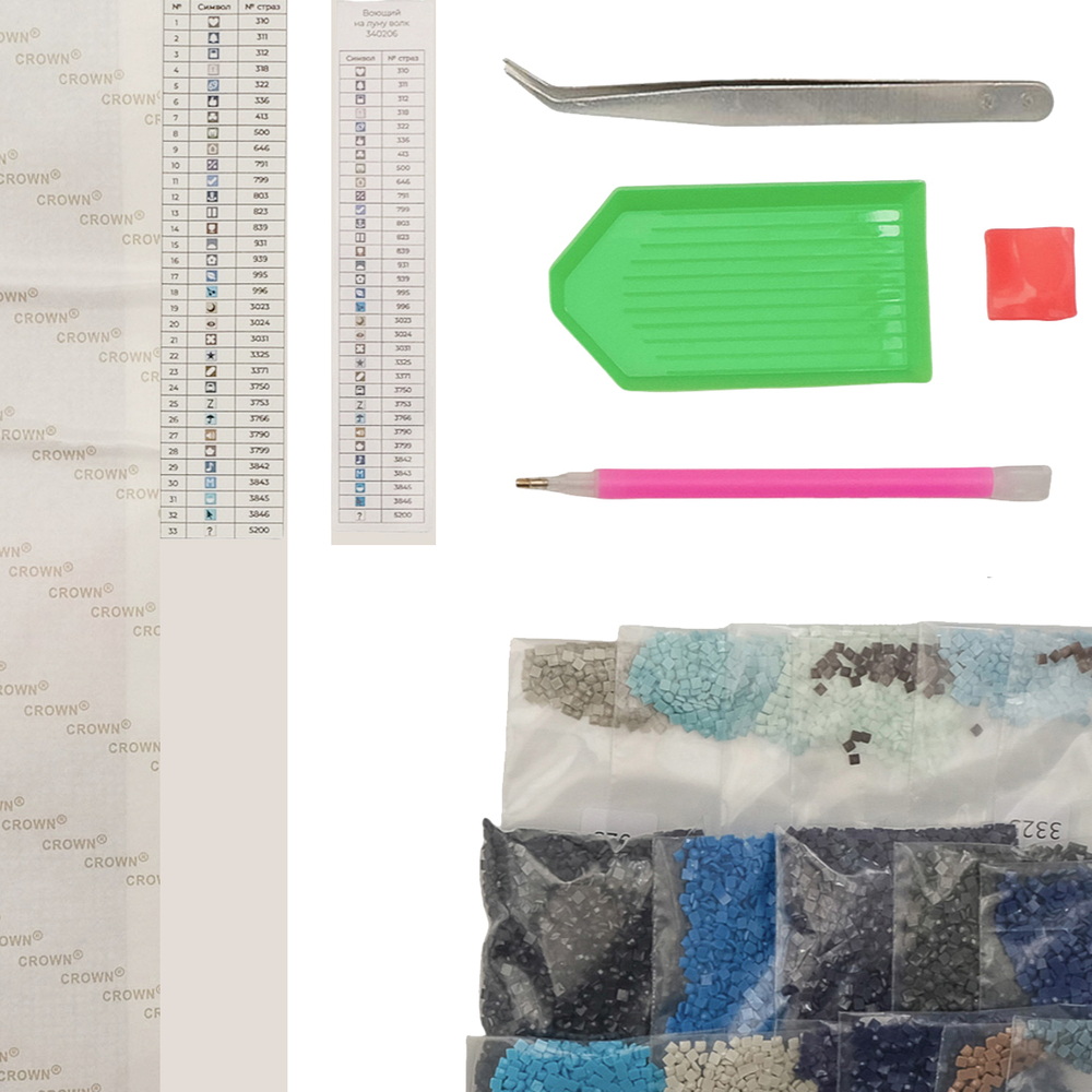 Схема выкладки сделана с учетом палитры DMC, максимально точно передает цвета и детали. Расшифровка схемы находится на холсте: так вы быстрее подберете стразы нужного цвета и легко найдете участок, где они будут располагаться. Клеевой слой надежно удерживает стразы на полотне.
