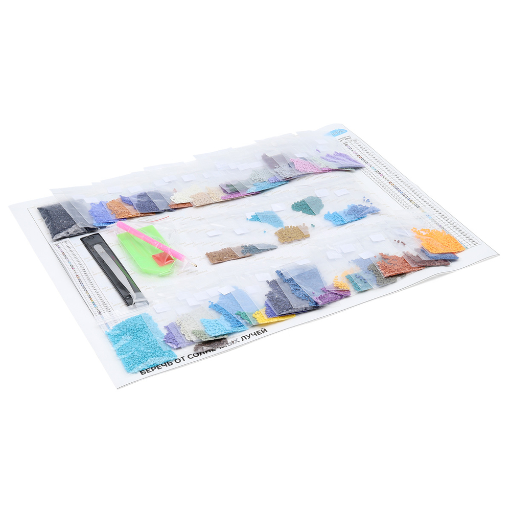 Схема выкладки сделана с учетом палитры DMC, максимально точно передает цвета и детали. Расшифровка схемы находится на холсте: так вы быстрее подберете стразы нужного цвета и легко найдете участок, где они будут располагаться. Клеевой слой надежно удерживает стразы на полотне.