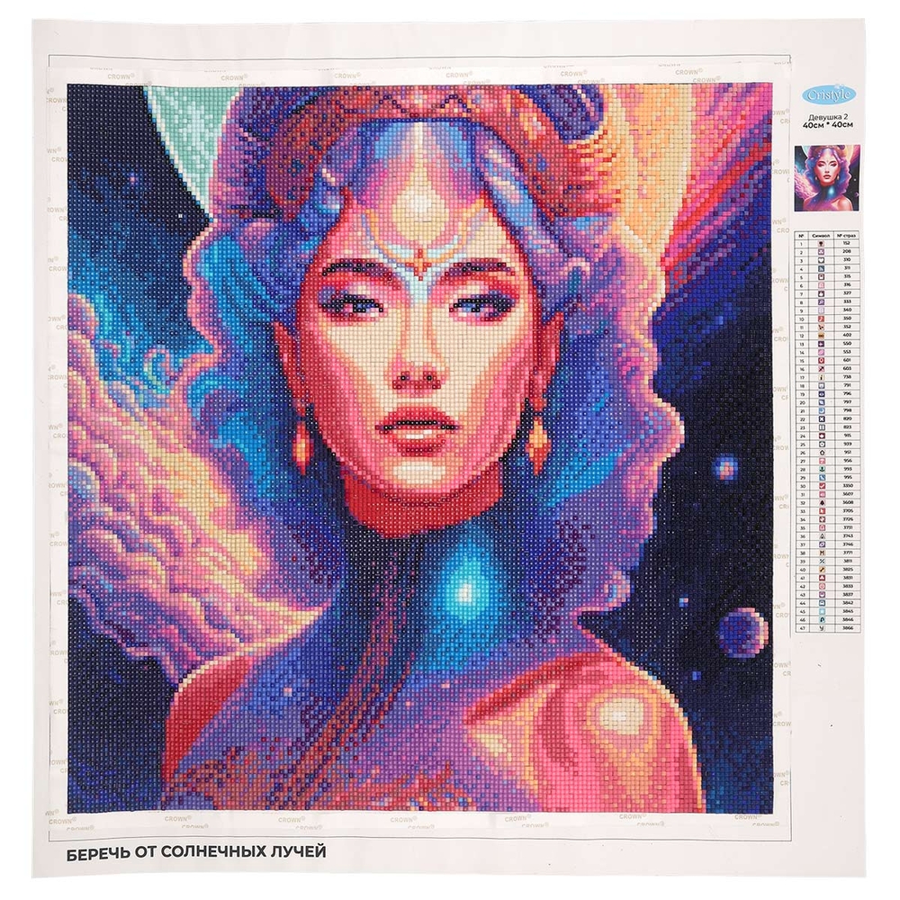 Схема выкладки сделана с учетом палитры DMC, максимально точно передает цвета и детали. Расшифровка схемы находится на холсте: так вы быстрее подберете стразы нужного цвета и легко найдете участок, где они будут располагаться. Клеевой слой надежно удерживает стразы на полотне.