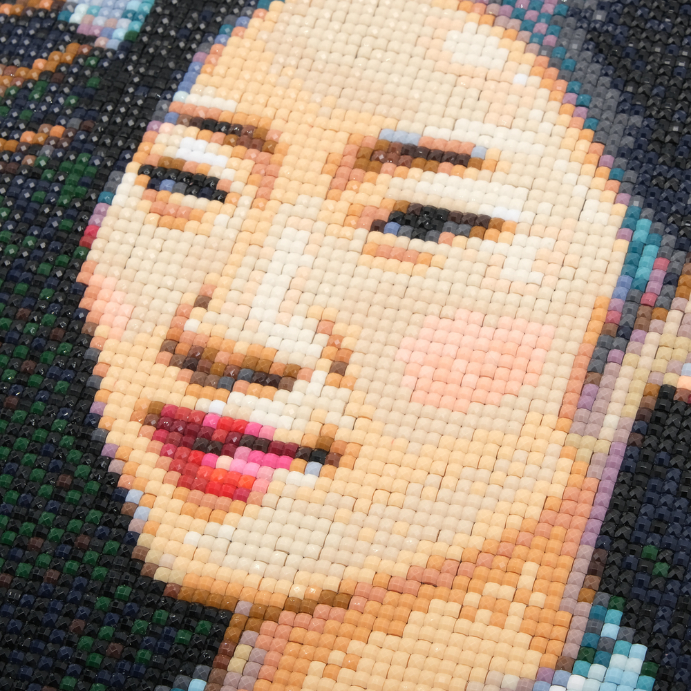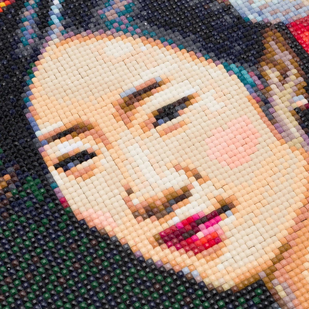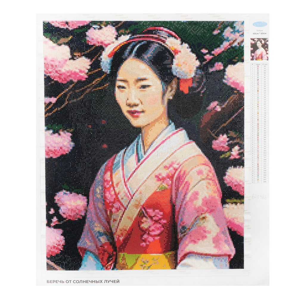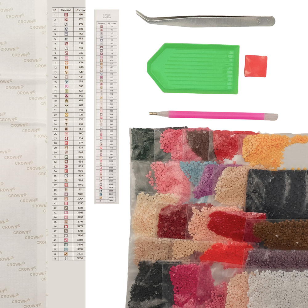 Схема выкладки сделана с учетом палитры DMC, максимально точно передает цвета и детали. Расшифровка схемы находится на холсте: так вы быстрее подберете стразы нужного цвета и легко найдете участок, где они будут располагаться. Клеевой слой надежно удерживает стразы на полотне.