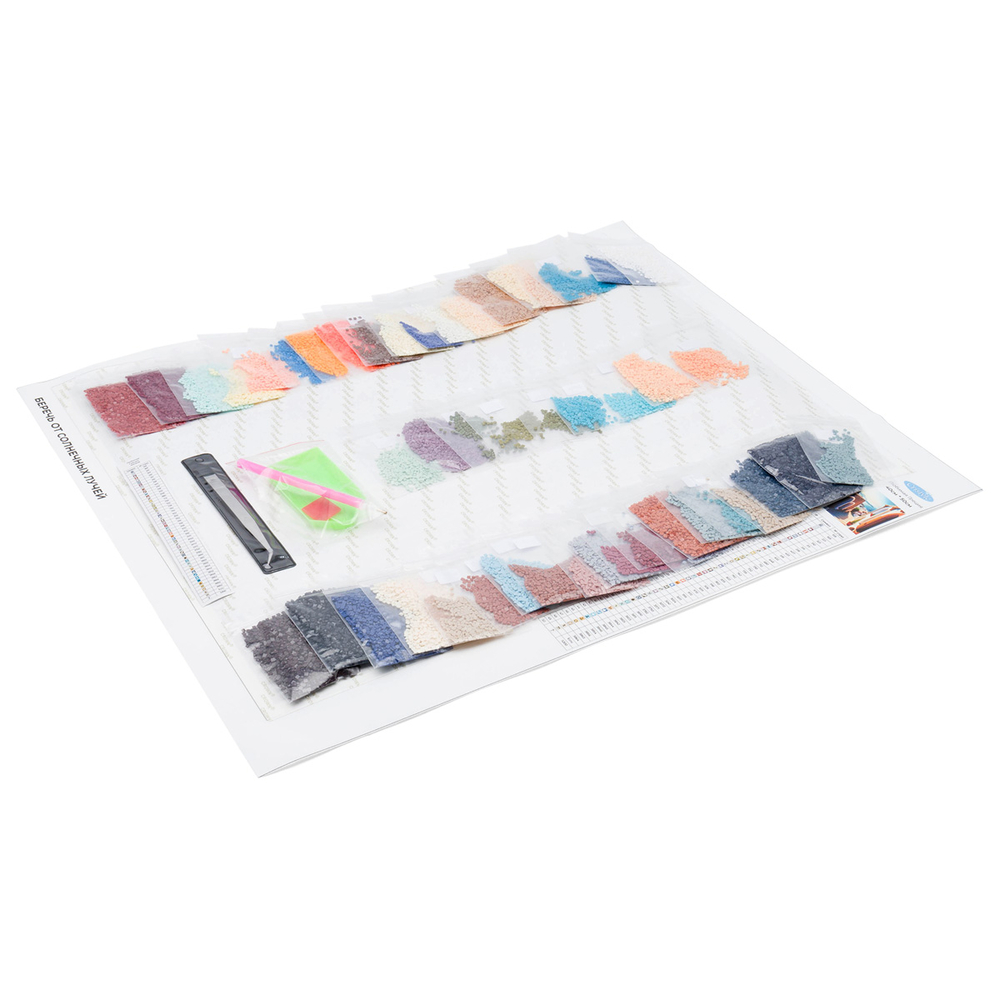 Схема выкладки сделана с учетом палитры DMC, максимально точно передает цвета и детали. Расшифровка схемы находится на холсте: так вы быстрее подберете стразы нужного цвета и легко найдете участок, где они будут располагаться. Клеевой слой надежно удерживает стразы на полотне.