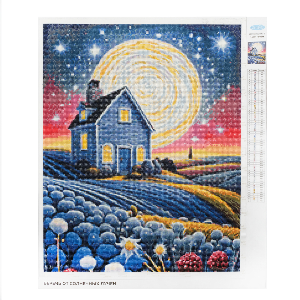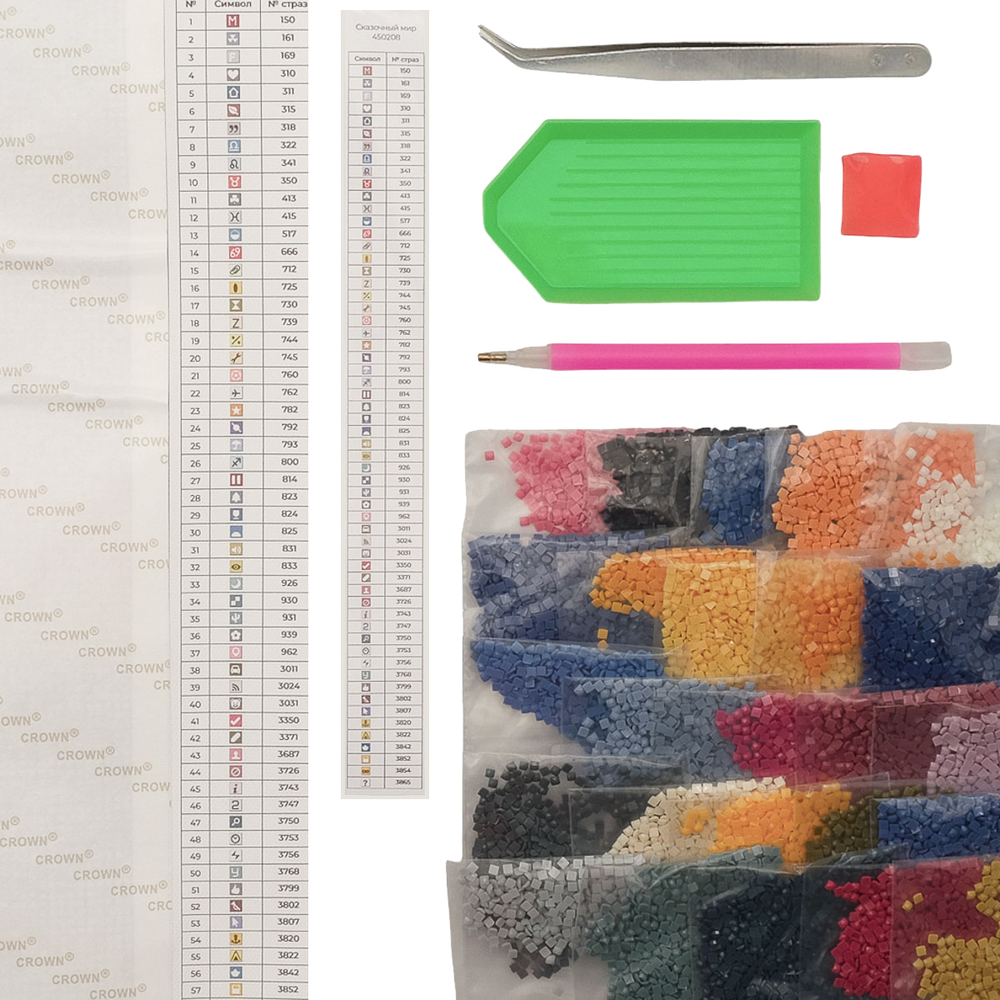 Схема выкладки сделана с учетом палитры DMC, максимально точно передает цвета и детали. Расшифровка схемы находится на холсте: так вы быстрее подберете стразы нужного цвета и легко найдете участок, где они будут располагаться. Клеевой слой надежно удерживает стразы на полотне.