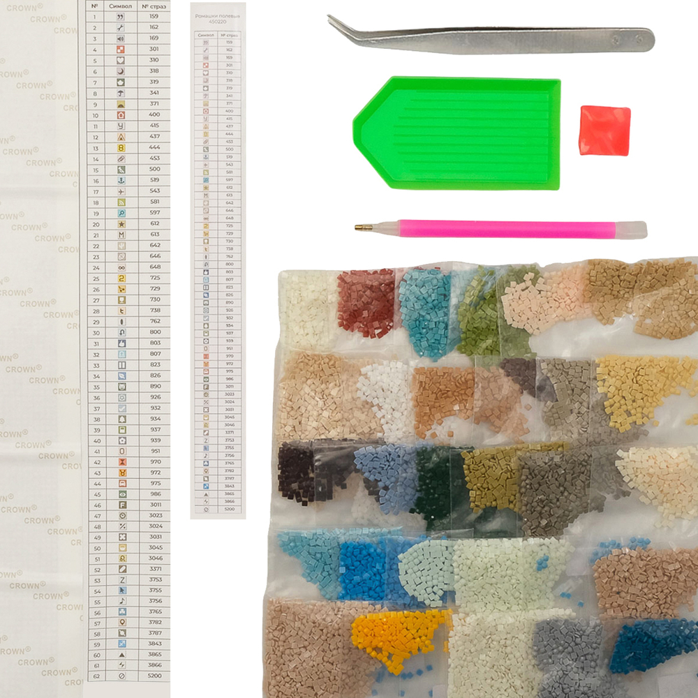 Схема выкладки сделана с учетом палитры DMC, максимально точно передает цвета и детали. Расшифровка схемы находится на холсте: так вы быстрее подберете стразы нужного цвета и легко найдете участок, где они будут располагаться. Клеевой слой надежно удерживает стразы на полотне.