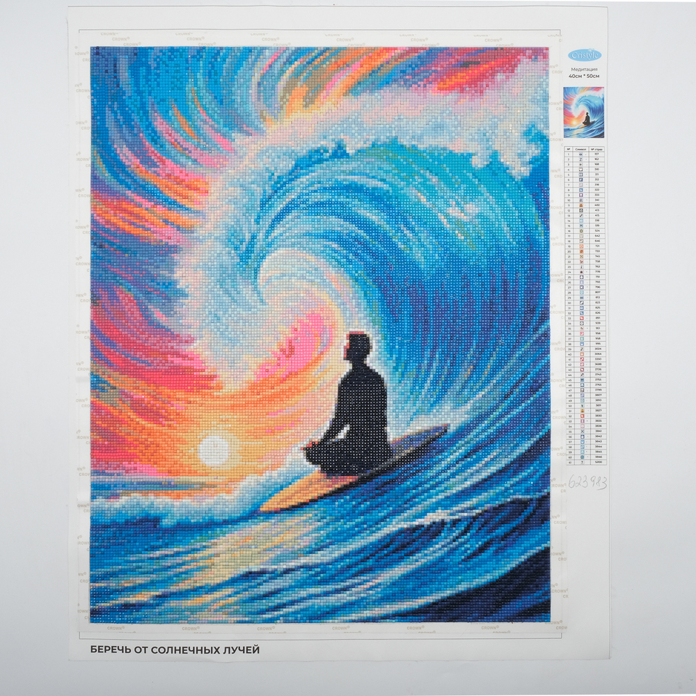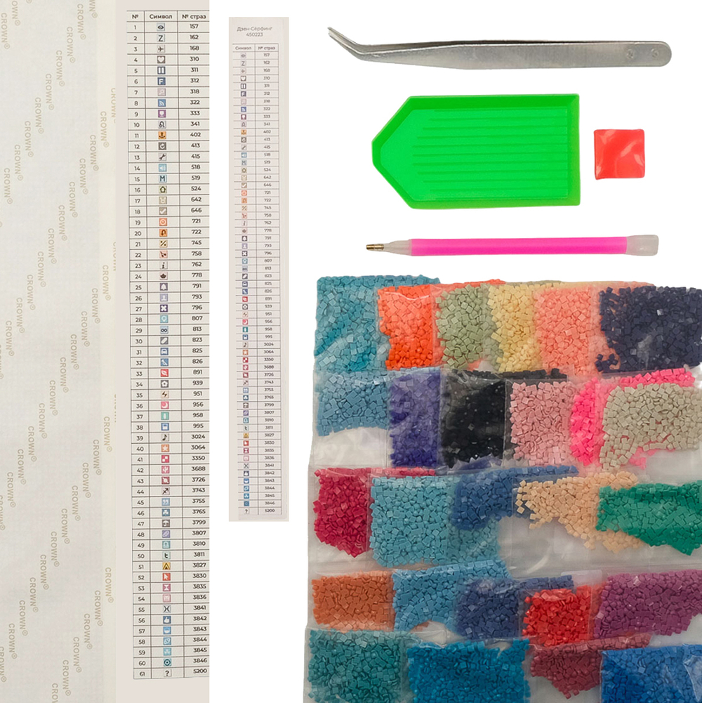 Схема выкладки сделана с учетом палитры DMC, максимально точно передает цвета и детали. Расшифровка схемы находится на холсте: так вы быстрее подберете стразы нужного цвета и легко найдете участок, где они будут располагаться. Клеевой слой надежно удерживает стразы на полотне.
