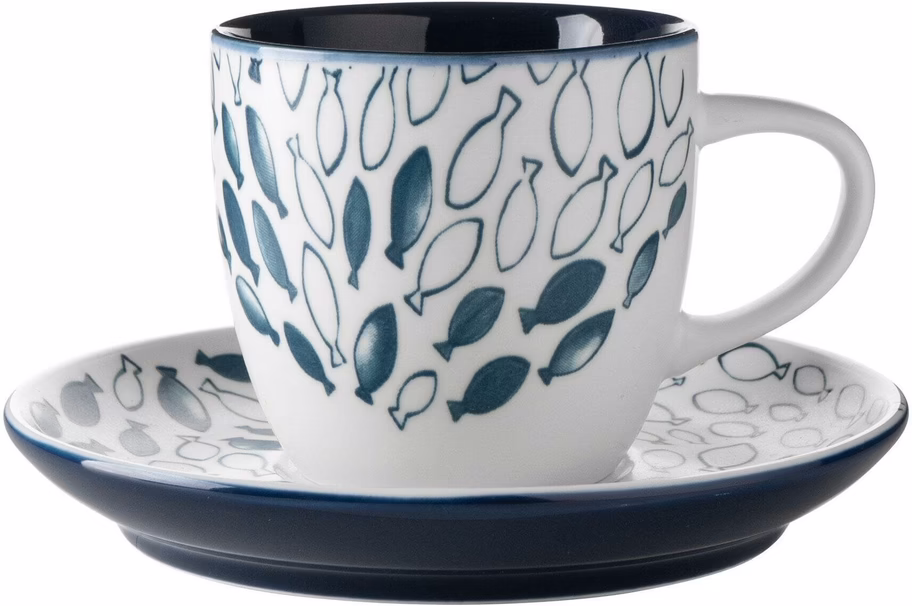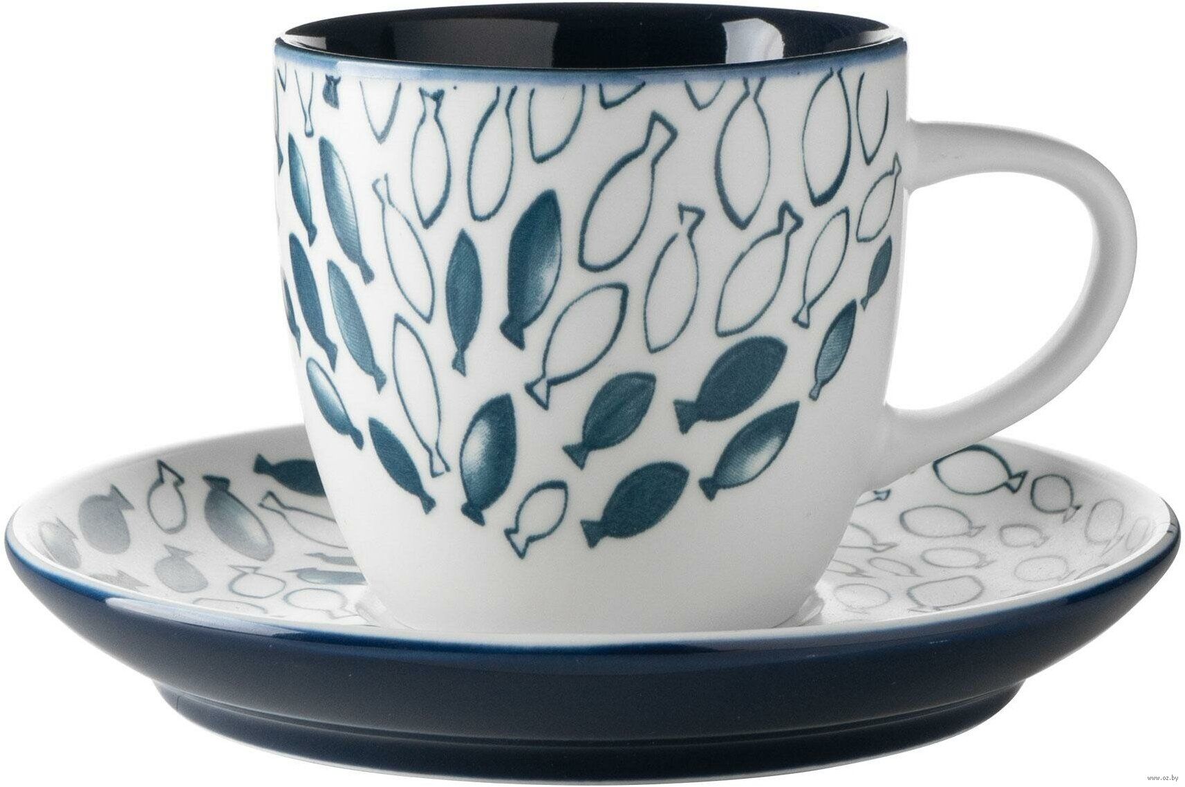 Чайный комплект состоит из чашечки цилиндрической формы и круглого блюдца (15х2,5х15 см), в выдержанных матовых цветах (белый, синий), с абстрактным дизайном в виде рыбок, узоров и растительности, такое исполнение является современным выражением смешанного Японского-Модерна. Изделие изготовлено из экологически безопасного материала – керамика (при высокотемпературном обжиге). Достоинства посуды из керамики проверены опытом прошлых лет – функциональностью в использовании, повышенной устойчивости к механическим повреждениям (сколам, царапинам).