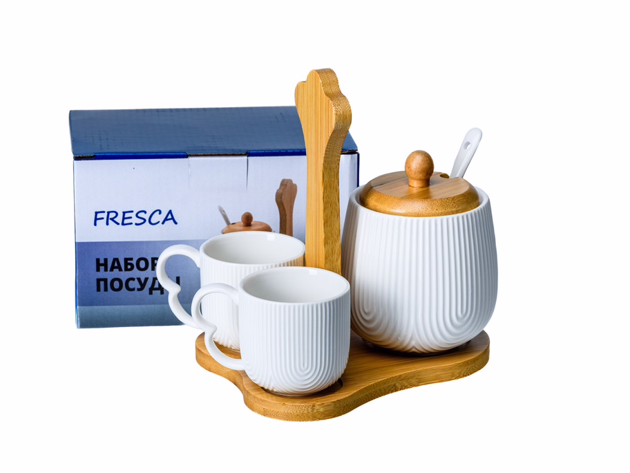 Набор состоит из сахарницы с крышкой и ложкой, двух кружек и деревянной подставки. Набор выполнен из высококачественного фарфора и натурального бамбука.